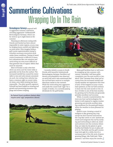 Summertime Cultivations Wrapping Up In The Rain Bermudagrass fairways respond well to aggressive summer cultivation, including aggressive ‘Celebration®’ Bermudagrass fairways, which can be verticut up to eight times in the summer. Planning an afternoon outing with friends and family has been almost impossible in some regions, as you may be dodging heavy rainfall and lightning as some point. Now imagine being a golf course superintendent trying to schedule necessary renovation work under these conditions. Timing of weed control treatments is difficult at times, but cultivations like core aeration and verticutting are even more difficult as they generate lots of organic debris that must be removed. Most of Florida is only a few feet above sea level, and the water table is generally not far from the surface. The increased rainfall has caused the water table to rise and soils remain saturated. As such, tire rutting from vehicles has been a common sight on recent visits. At times, even daily mowing has been impossible. The plant growth regulator, Primo® has been helpful at slowing turf growth and preventing excessive clippings and mower scalping.