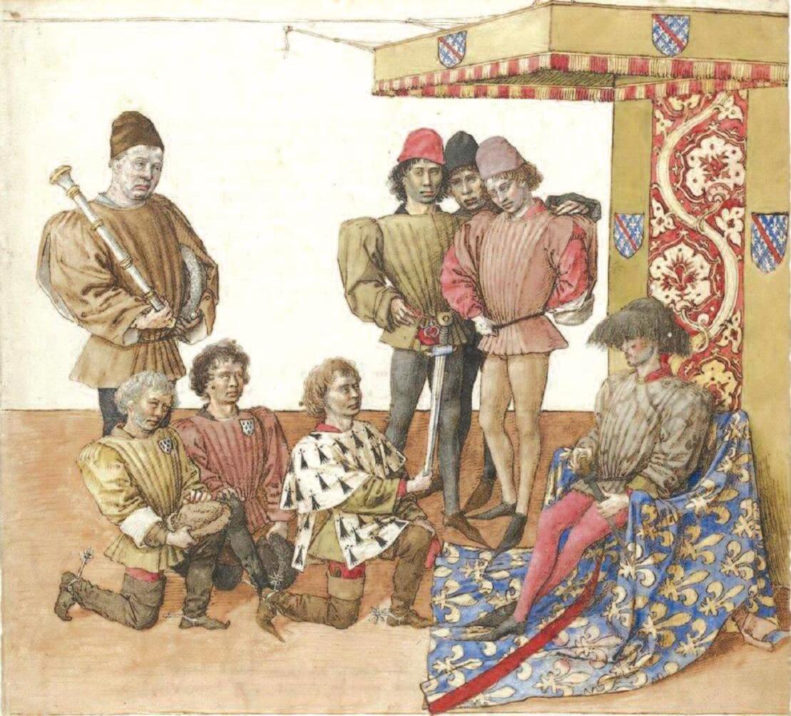 Due capilettera del XIV secolo raffiguranti la proclamazione, da parte del re, di un nuovo cavaliere