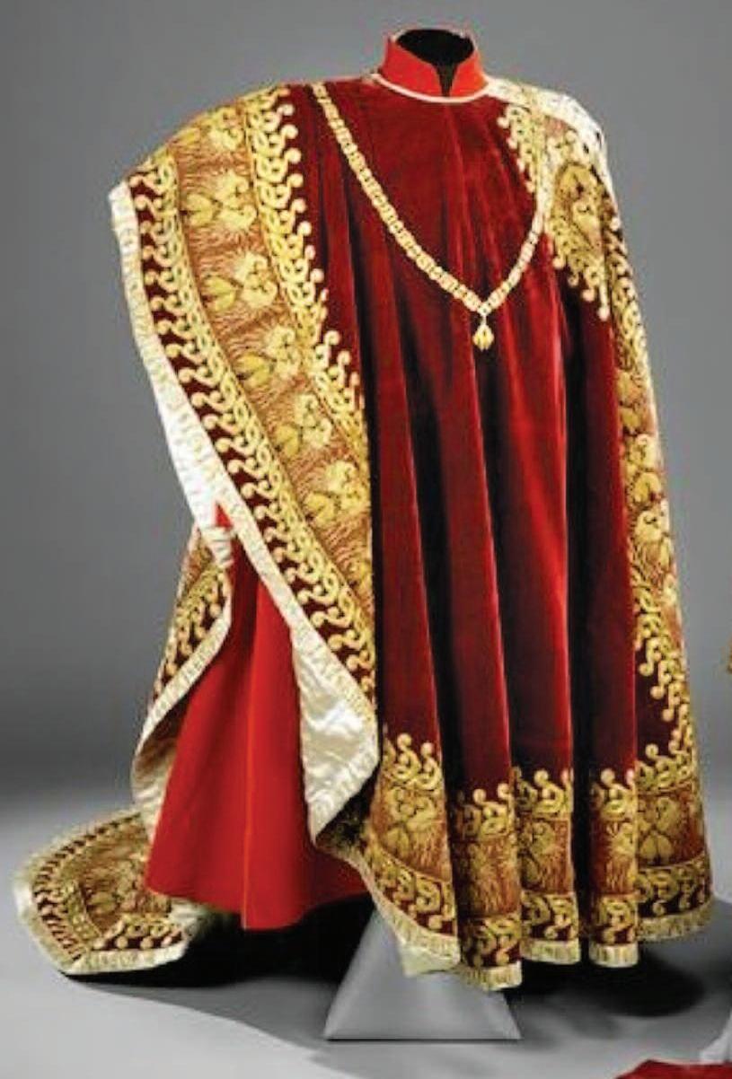 Da sinistra verso destra Due ricchissime vesti di altrettanti blasonati ordini cavallereschi: sono quelle dell’Ordine del Toson d’Oro (Vienna, Museo del Tesoro Imperiale) e dell’Ordine della Giarrettiera (Stoccolma, Palazzo Reale)
