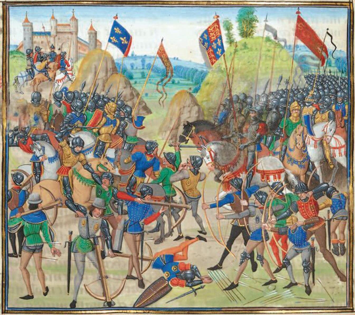 tato la distruzione in Francia, e molti lo imitarono; oppure c’era Giovanni di Faukemont che giurò di non risparmiare né convento, né altare, né donna incinta, né fanciullo, né parenti per servire re Edoardo. E ci furono anche quelli che giurarono di non tagliarsi la barba o di non sedersi mai, oppure di portare una catena ogni domenica al piede sinistro, o dei bracciali d’oro, fino a giurare di non mangiare finché non avessero incontrato gli Inglesi sul campo di battaglia