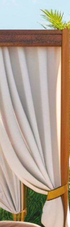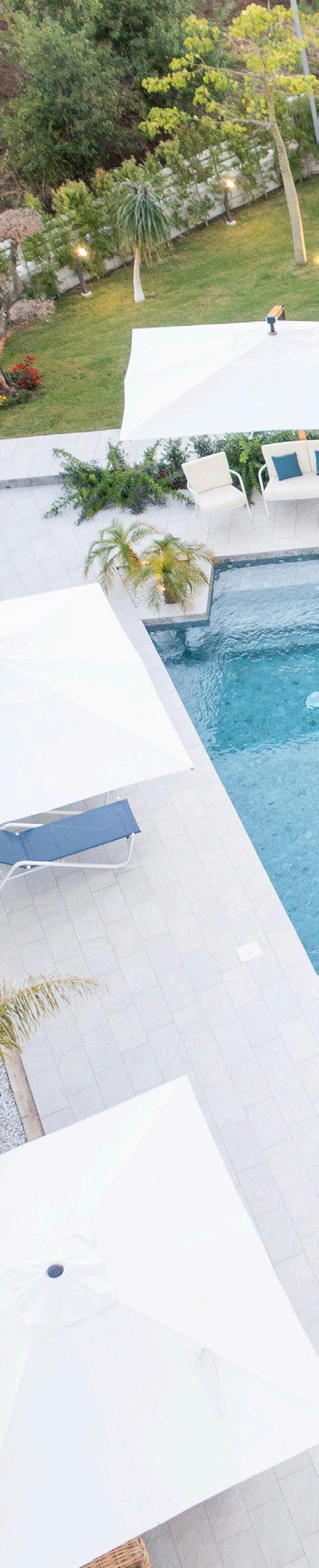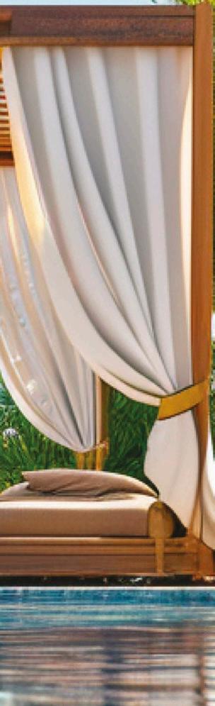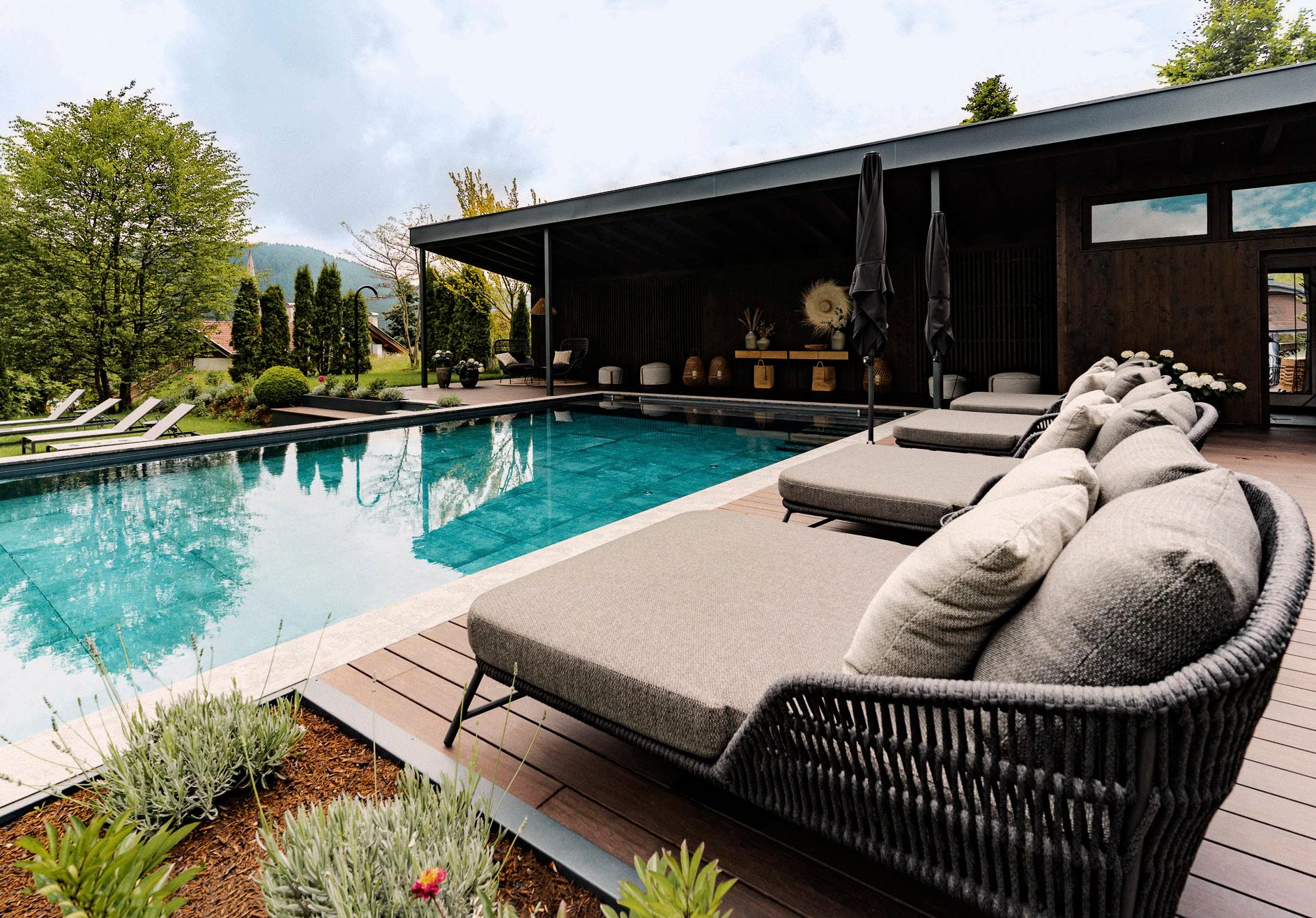 ven fibres and waterproof, UV-resistant technical fabrics guarantee durability and easy maintenance, while maintaining a warm and sophisticated aesthetic. Handcrafted textures – such as rope or synthetic rattan weaves – add a natural, textured touch that is highly appreciated for creating a welcoming and informal atmosphere. The colour palette is also evolving: the classic combination of white and anthracite is complemented by shades inspired by nature – sand, ochre, forest green, deep blue – often used as a neutral base on which to add more vibrant accents, such as sunny-coloured cushions, decorative outdoor rugs or parasols with contrasting borders and retro fringes. Finally, lighting plays a key role: rechargeable portable lamps, wall lights, recessed floor lights or contemporary-style lanterns help to extend the usability of spaces even in the evening hours, creating soft and evocative settings. The picture is completed by specially designed flooring, often in stoneor wood-effect stoneware, which ensures aesthetic continuity and non-slip properties, ideal for the solarium area. The aim is twofold: to guarantee safety and, at the same time, enhance the surrounding environment through textured surfaces that are consistent with the style of the home. In short, outdoor poolside furniture is establishing itself as a true living experience, combining comfort, aesthetics and durability. It is a new way of experiencing the outdoors, which transcends seasonality and interprets the garden – or terrace – as a dynamic, flexible space that is deeply connected to the quality of everyday life.