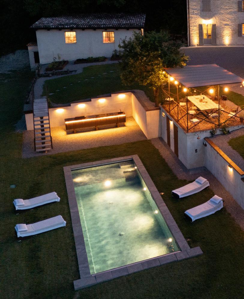 In recent times, there has been a growing trend in Italy to use lighting as a real element to create atmosphere, especially in outdoor spaces or areas dedicated to relaxation. It is no longer just a question of functional lighting, but of a way to create evocative, welcoming and personalised environments using small fibre optic light points, coloured LED spotlights, electric candles, lanterns or warm light lamps, etc. When it comes to pool lighting, there is a trend that leaves room for imagination but also focuses on energy saving, thanks to solutions such as LEDs (also with smart control and/or dimming), which, in addition to lasting a long time and offering beautiful light effects, reduce consumption and require less maintenance. Pool lighting is no longer just a purely technical issue, but a real scenic element: light effects, colours, RGB effects and, more generally, proper integrated lighting design (including the use of simulation software to optimise positions and effects) allow the pool to be lit correctly and create a striking visual impact that blends perfectly with the breath-taking landscapes we are fortunate to have in Italy. In addition, pool edges, paths and relaxation areas are treated as furnishing elements, and lighting them has become essential.