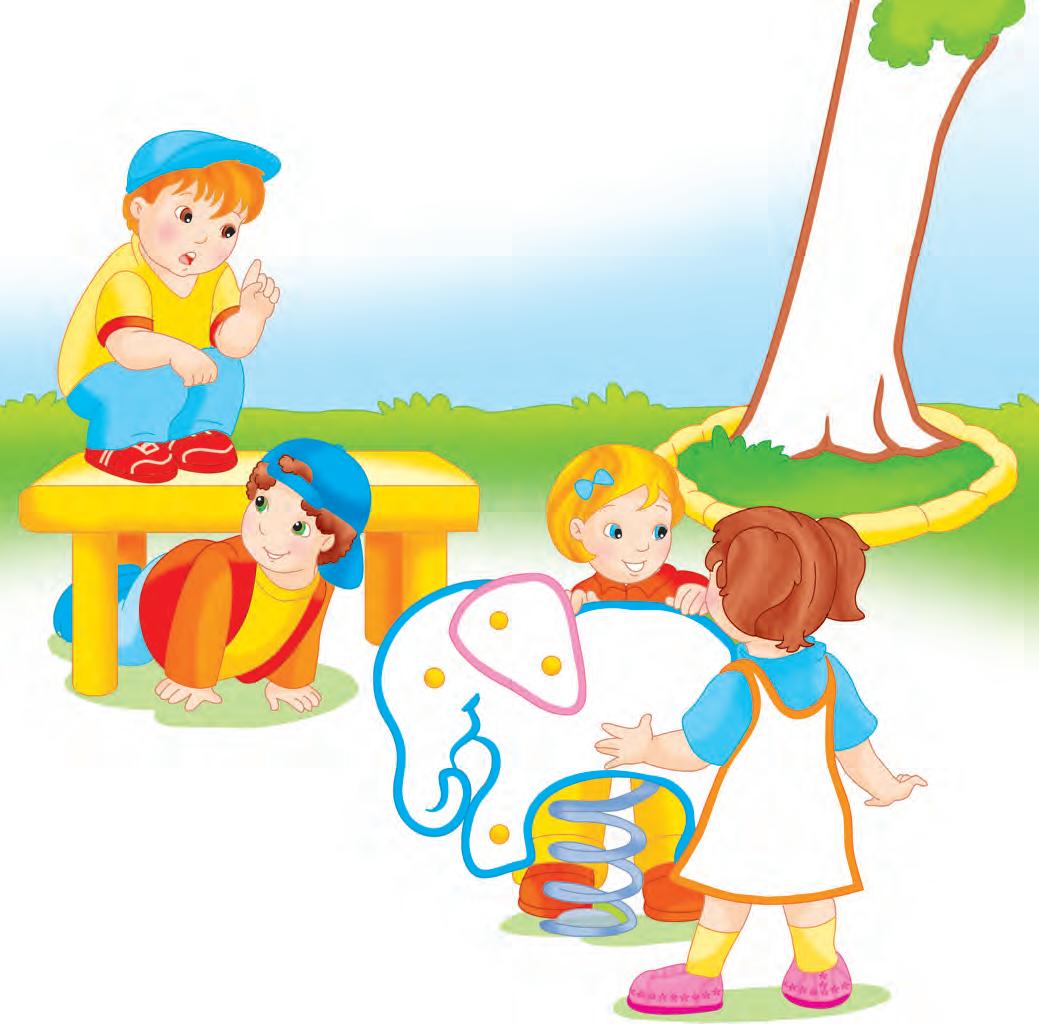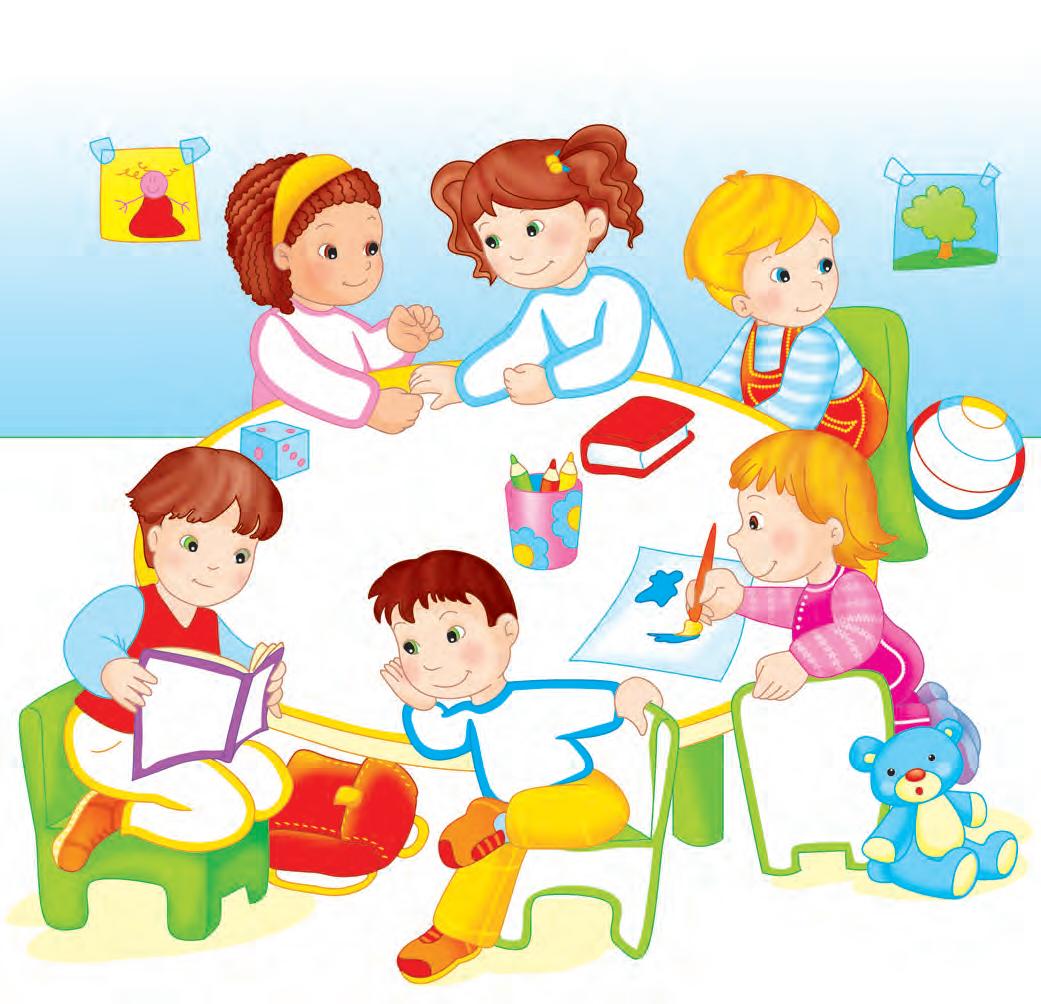 Spune ce fac la grădiniță copiii din imagine. De exemplu: Un băiat îi spune unui coleg ce vede în carte.