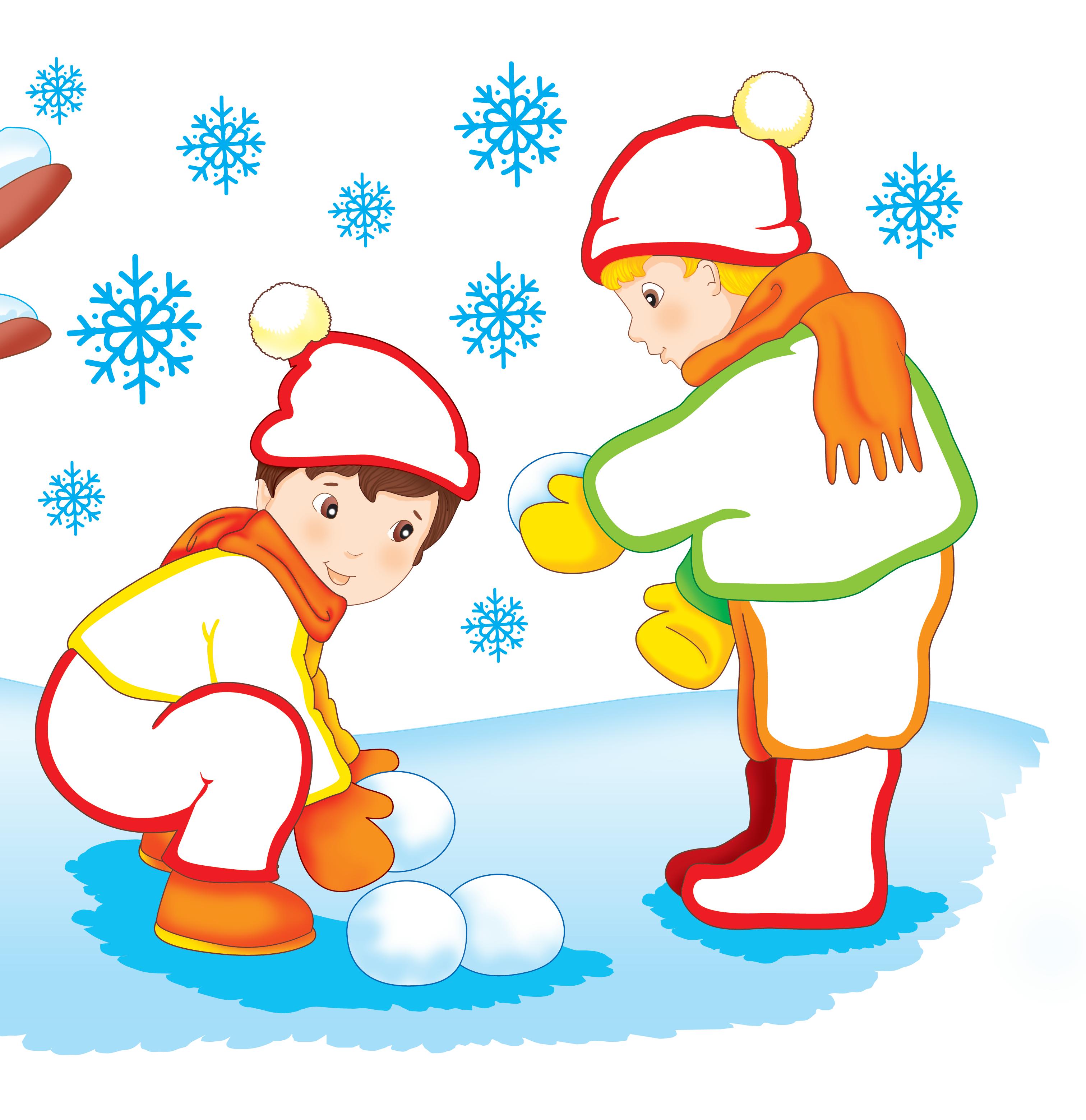 Desenează și alți bulgări de zăpadă între cei doi copii.