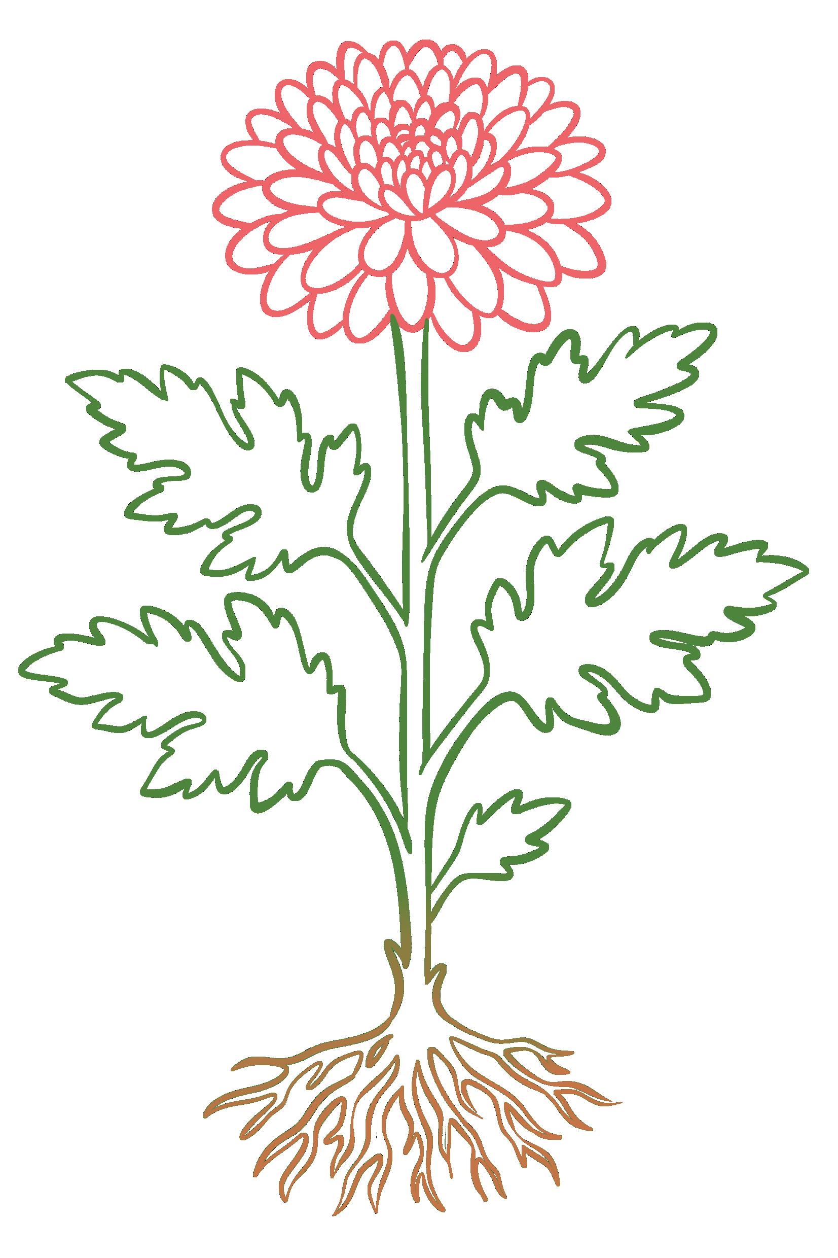 ✿ Colorează cu galben floarea crizantemei și cu verde frunzele tufănicii. Încercuiește rădăcinile celor două plante.