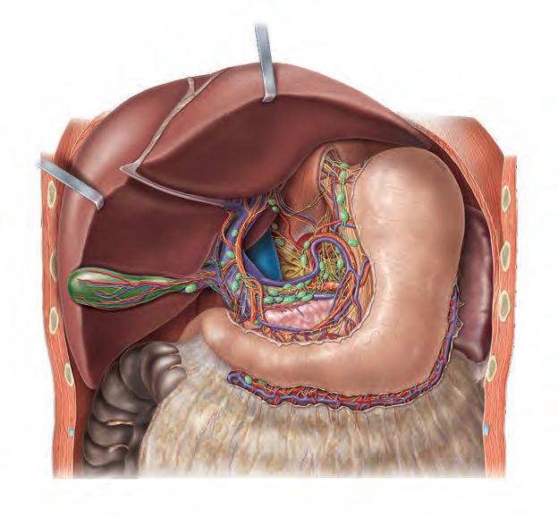 Fig. 6.7 Poziția viscerelor în abdomenul superior; vedere ventrală. Omentul mic, dintre ficat și curbura mică a stomacului, a fost înlăturat pentru a vizualiza bursa omentală.