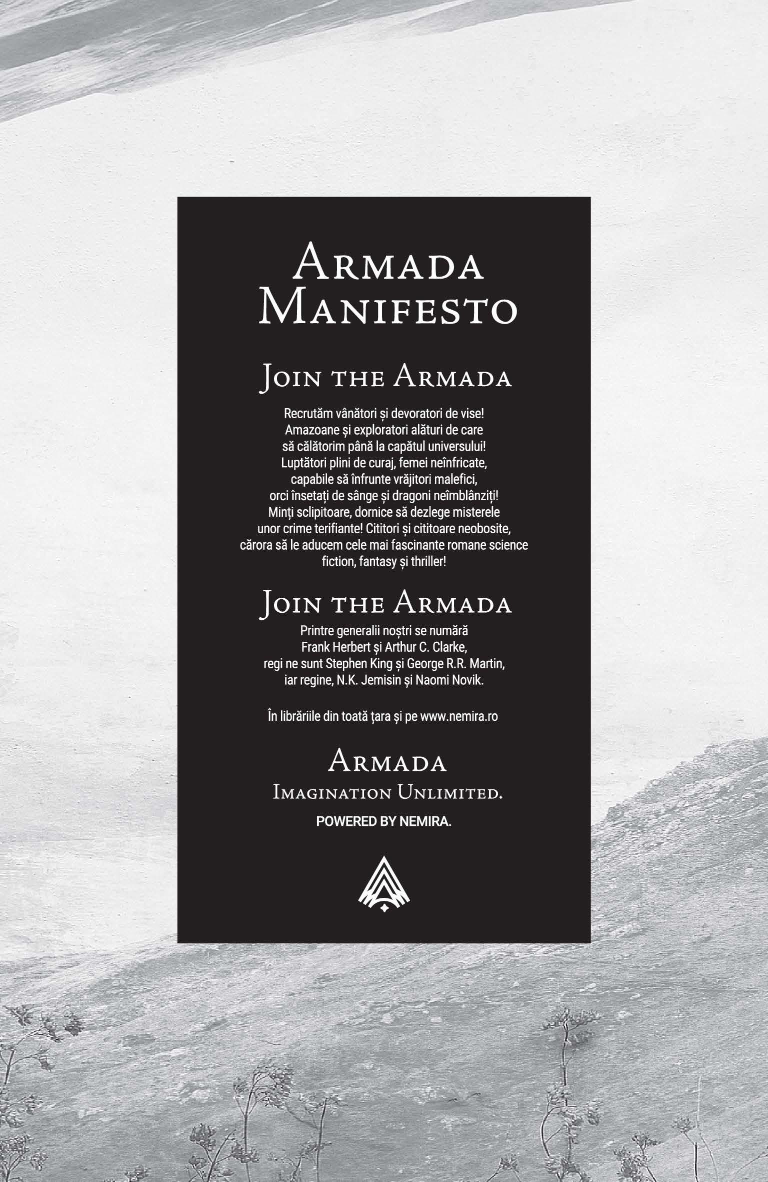 Dar, dincolo de toate aceste sunete, se întindea liniștea adâncă a nopții scoțiene. Am rămas cu totul nemișcată, căutând‑o. Trecuseră douăzeci de ani de când nu o mai simțisem, însă puterea mângâietoare a întunericului era încă acolo, cuibărită între munți. Am băgat mâna în buzunarul halatului și am scos hârtia împăturită – o copie a listei pe care i‑o dădusem lui Roger Wakefield. Era prea întuneric pentru a o putea citi la lumina focului, însă nu aveam nevoie să disting numele. Am despăturit hârtia pe genunchiul meu acoperit cu mătase și am rămas privind fără să discern rândurile ininteligibile scrise la mașină. Mi‑am plimbat încet degetul peste fiecare rând, murmurând pentru mine însămi toate numele înscrise, ca într‑o rugăciune. Ei aparțineau nopții reci de primă vară mai mult decât mine. Cu toate acestea, am rămas cu privirea îndreptată spre flăcări, lăsând întunericul de afară să umple cotloanele goale din mine. Și rostindu‑le numele ca și cum i‑aș fi invocat, am făcut primii pași în urmă, traversând întunericul pustiu unde mă așteptau.