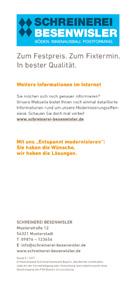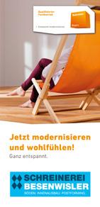 Manche Gäste kommen ungebeten! Gebäudesicherheit vom SchreinerMusterstraße 12 | 54321 Musterstadt T 09876 - 123456 | E info@schreinerei-besenwisler.de www.schreinerei-besenwisler.de Als qualifizierter Fachbetrieb Gebäudesicherheit stellen wir sicher, dass Langfinger draußen bleiben. Wir sind der Partner zum Schutz Ihrer vier Wände und beraten Sie in allen Fragen zur Planung, Nachrüstung und Wartung. So wohnen Sie sicher und beruhigt! Manche Gäste kommen ungebeten! Gebäudesicherheit vom Schreiner Musterstraße 12 54321 Musterstadt T 09876 - 123456 www.besenwisler.de Sie wünschen sich eine Veränderung in den eigenen vier Wänden? Ganz egal, ob Sie Ihr Zuhause an Ihre geänderten Ansprüche anpassen, sie vergrößern oder renovieren. Lehnen Sie sich zurück. Wir sind Ihre Modernisierungsexperten und kompetenten Partner bei der Umsetzung! Jetzt modernisieren und wohlfühlen! Ganz entspannt Musterstraße 12 54321 Musterstadt T 09876 - 123456 www.besenwisler.de