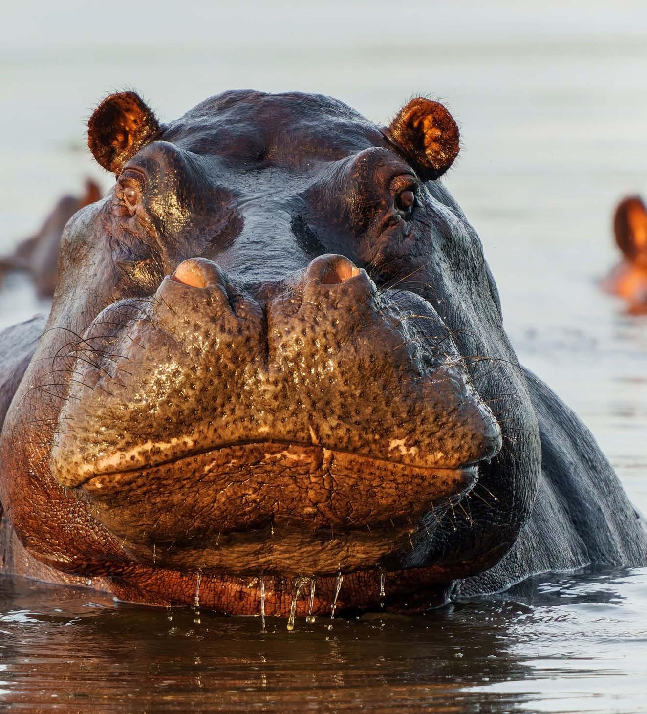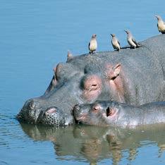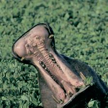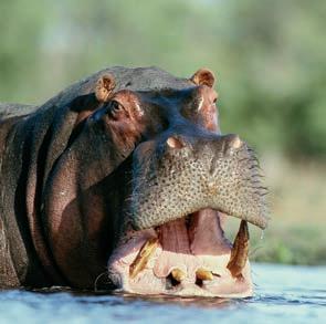 El hipopótamo es uno de los animales más grandes que vive en los ríos y lagos de África. Aunque pasan la mayor parte del tiempo en el agua, los hipopótamos salen por la noche para comer hierba en la tierra. Tienen cuerpos enormes, bocas muy grandes y dientes fuertes que usan para defenderse.