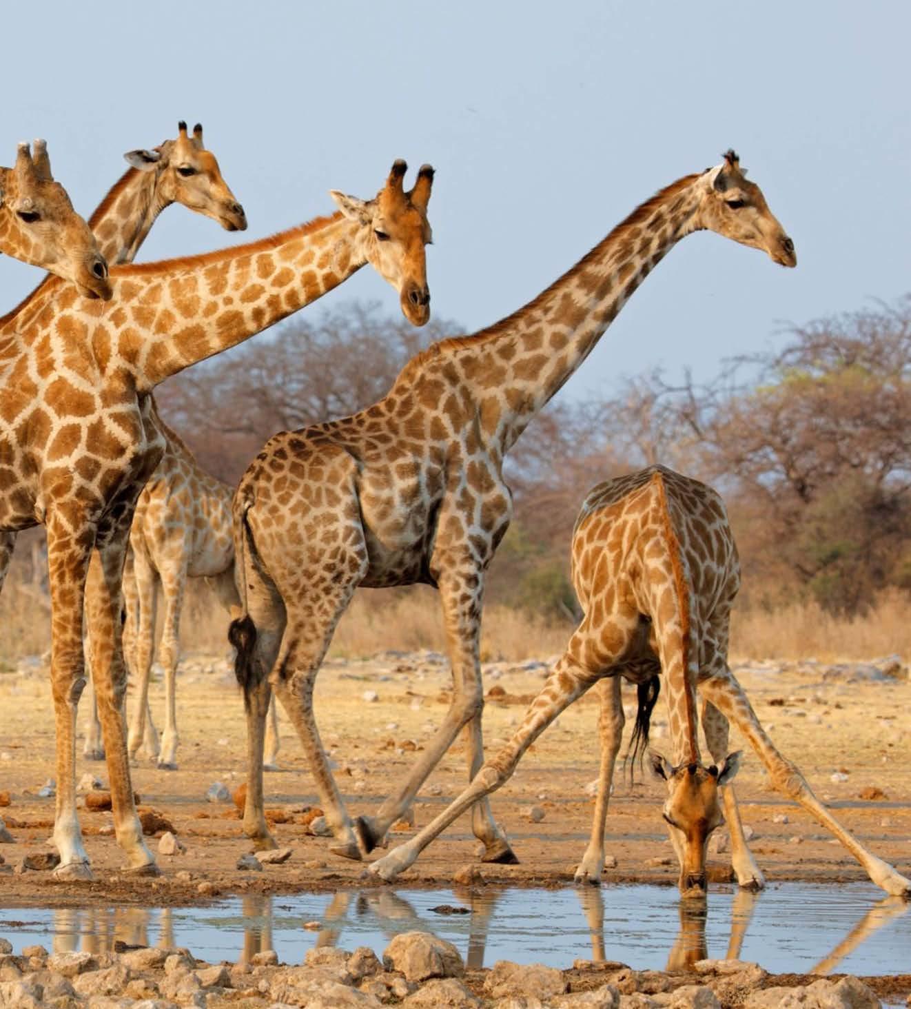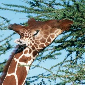 La jirafa es el animal más alto que existe: puede llegar a medir más de 5 m. Estos gigantescos herbívoros, que se alimentan de hojas y brotes de los árboles, habitan en las sabanas de África. Son pacíficos, muy sociables y poco territoriales. Su pariente, el okapi, prefiere los bosques húmedos.