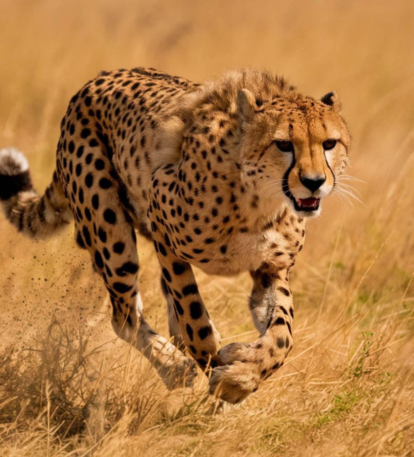 Es el animal terrestre más rápido del mundo. Ha hecho de la velocidad su principal arma de caza, aunque tampoco duda en emplearla para huir cuando se siente amenazado por algún peligro. Este felino es delgado y ligero. Su figura esbelta y su andar pausado lo convierten en un animal muy elegante.