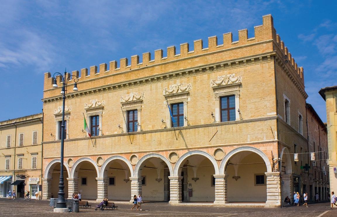 so irregolare che occupa l’intero isolato racchiuso tra la Piazza del Popolo, via Zongo, via Barignani e il corso XI Settembre, con la facciata quattrocentesca fatta costruire da Alessandro Sforza sulla ‘Piazza Grande’. Le sue vicende costruttive sono legate alle signorie malatestiana, sforzesca e roveresca, succedutesi