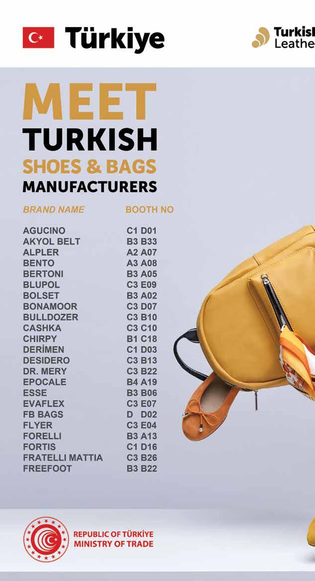 Espositore Company Pad. Hall Stand LUJO DIS TICARET LIMITED SIRKETI C3 F01 LUKS AYAKKABICILIK SAN VE TIC LTD STI B1 D19 MAGO SHOES D E08 MAMMAMIA A.S B3 E17 MARIS IC VE DIS TICARET LIMITED SIRKETI C3 C08 MARZIA IC VE DIS TIC. SAN. LTD. STI. C1 A01 MEHMET GULER AYAKKABI VE DERI MAM. SAN. VE TIC. LTD. STI C2 C09 METIN AYAKKABI VE TEKSTIL SAN.TIC.LTD.STI. B4 A29 MORSETTO AYAKKABI SAN VE TIC LTD B3 B02 MUSTAFA KOC AYAKKABI TEKS. SAN. TIC. LTD. STI. B3 B01 MUYA FOOTWEAR C3 C06 MYM SHOES B3 A27 NATURSOFT B3 A01 NEBI ENDICAN GIYIM SAN. TIC. LTD. STI. B3 B15 NEW WORLD B3 B32 NOVA AYAKKABICILIK SAN VE TIC LTD STI C3 E03 OBAS AYAKKABICILIK SAN.VE TIC.LTD.STI. B3 A03 ON-AR AYAKKABI KALIP SAN. TIC. LTD. STI. C1 C01 ONDER AYAKKABI SAN VE TIC LTD STI B3 B06 ORTAKLAR SHOES C3 E04 ÖZ ORTAKLARAYAKKABI DERI SANAYI TICARET LIMITED SIRKETI D C17 OZIL AYAKKABI DERI SAN DIS TIC LTS STI B3 D19 OZKARA KIMYA SAN. TIC. A.S. C3 E09 PALMIYA AYAKKABICILIK SAN. VE TIC. LTD. STI C3 B19 PEKER SHOES A3 B09 PENTA AYAKKABI DERI SAN. VE TIC. A.S. B3 B22 PERA DONNA / DTGM DIS TICARET GELISTIRME MERKEZI LTD. STI C3 D07 PIENN - ENDER B1 C03 PLASTIBO PLASTIK TERLIK SAN. VE TIC. LTD. STI C1 B04 PONCHIQ C3 F03 PREND AYAKKABI VDERI PAZ. SAN. VE TIC. LTD. STI C3 B06 RASYONEL DERI SANAYI TICARET LIMITED SIRKETI B2 A36 REAL FOOTWEAR - OZARPA AYAKKABICILIK SAN. VE TIC. LTD. STI. C1 D18 ROBERTO LENZI B1 D07 ROGGERO AYAKKABI C3 F14 ROVIGO DERI GIYIM SAN, VE TIC. LTD.STI. B1 C04 RSÇ ÇANTA ULUS. HED. ESYA TESK. ITH. IHR. LTD. STI D B02 SAHIN TABAN AYAKKABICILIK SAN.TIC.LTD.STI C3 B17 SAHINLER AYAKKABICILIK SAN. TIC. LTD. STI C3 E08 SAYINER AYAKKABI IC VE DIS TICARET SANAYI LIMITED SIRKETI C3 B26 SEKADA C3 B04 SEKADA - DAVARCI KUNDURA SAN.VE. LTD. STI. C3 B04 SERAY AYAKKABI VE TERLIK SAN. TIC. LTD. STI. C1 E25 SERDAL TÜRKOGLU DIS TICARET LIMITED SIRKETI C3 A30 SHERLOCK SOON B4 B24 SHOES MARKET C3 C18 SHOES PARTNER TEKSTIL SAN VE TIC AS B4 E04 SOLARIZ - SAHIN TABAN VE AYAKKABICILIK C3 B17