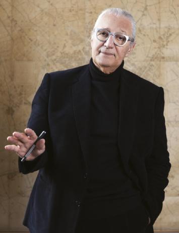 Alan is wearing his denim-effect stretch cashmere suit and is holding his iconic piece, the bag he describes in the interview in deerskin and stretch cashmere.