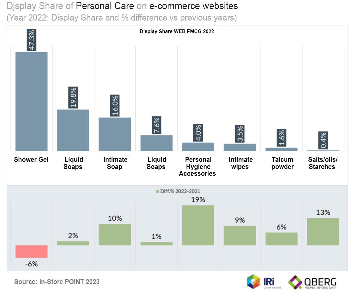 QBerg, Italian Research Institute, leader in price intelligence and multichannel strategy-analysis services (flyers, physical stores, e-commerce and newsletters), analyzed the supply trend of the Personal Hygiene Market (Shower Gel, Liquid Soap, Intimate Skin Care, Intimate wipes, talcum powder, Salts/Oils/Starches) in the web channel in 2022. The used parameters were: Display Share, TOP5 Producers and PL Display Share and Average Price.