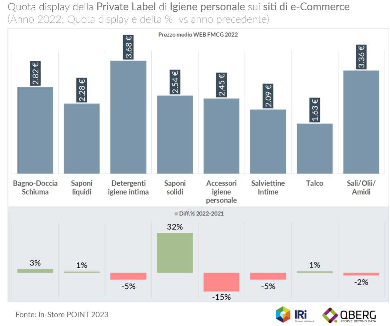 QBerg, Istituto di Ricerca italiano leader nei servizi di price intelligence e di analisi delle strategie assortimentali cross canale (flyer, punti vendita fisici, e-commerce e newsletter), ha analizzato l’andamento dell’offerta del mercato dell’Igiene Personale (Bagno-Doccia Schiuma, Saponi liquidi, Detergenti igiene intima, Saponi solidi, Accessori igiene personale, Salviettine Intime, Talco, Sali/Olii/Amidi) nel canale web nel 2022. I parametri utilizzati sono: Quota Display, Quota Display Top 5 Produttori e Private Label e Prezzo medio.