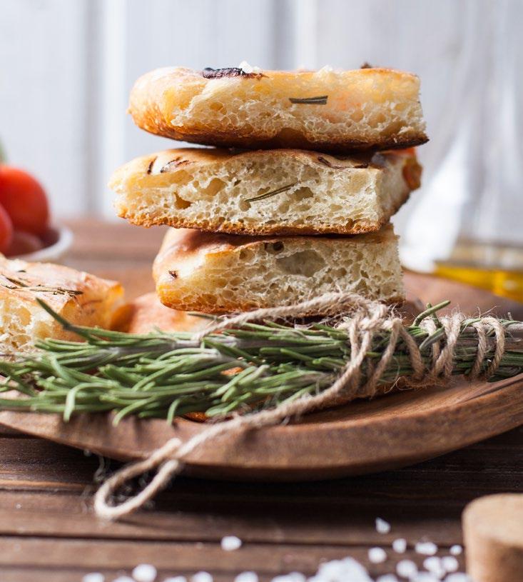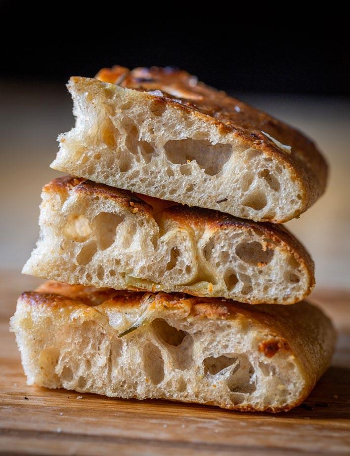 Cappelli e acqua di mare microfiltrata. Prima della cottura su pietra, la focaccia viene ricoperta con olio extravergine di oliva.