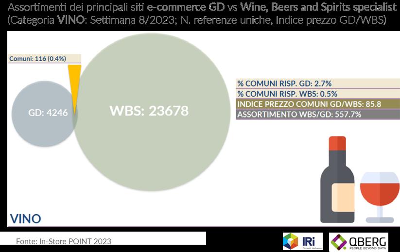 Cosa c’entra la Gd? È pertinente, in quanto il vino, i liquori, le birre e le bollicine, italiane ed estere, sono da sempre presenti sugli scaffali virtuali dei siti di e-commerce, sia per quanto riguarda la Gd vera e propria, ovvero i siti che hanno alle spalle una catena di ipermarket e/o supermarket, sia per gli operatori “web pure”, come Amazon Fresh e Tulips Market, e gli operatori di Q-Commerce, come Macai e Getir. In questa analisi abbiamo voluto confrontare gli assortimenti dei principali siti della Gd con gli e-commerce dei “Wbs specialist”, per analizzare differenze, sovrapposizioni, indici di prezzo dell’assortimento comune in una singola settimana, dal 20 al 26 febbraio, al fine di fotografare la situazione tipica di un consumatore che si trovasse a dover fare acquisti in un determinato momento dell’anno, relativamente lontano da festività che condizionerebbero pesantemente le offerte in corso.