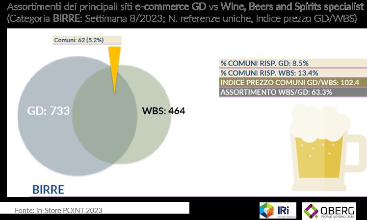 Sulla categoria birre dobbiamo premettere che, come per il vino, le tipologie di prodotti proposti dai due canali sono sostanzialmente diverse: predilezione per il segmento delle produzioni artigianali ed estere per i Wbs, molto più “commerciale” per la Gd. Quest’ultima, infatti, in questa categoria registra un assortimento pari a 733 referenze uniche, contro le 464 degli specialisti: l’assortimento in comune è di sole 62 referenze, pari al 5,2% del totale. In questo caso, l’indice di prezzo di ciò che è in comune va a favore degli specialisti (anche se di poco) in quanto la Gd costa mediamente il 2,4% in più.