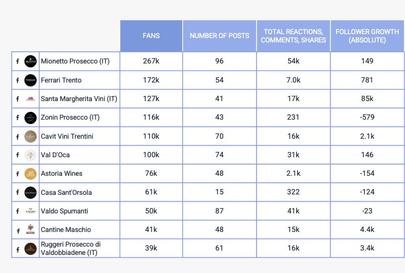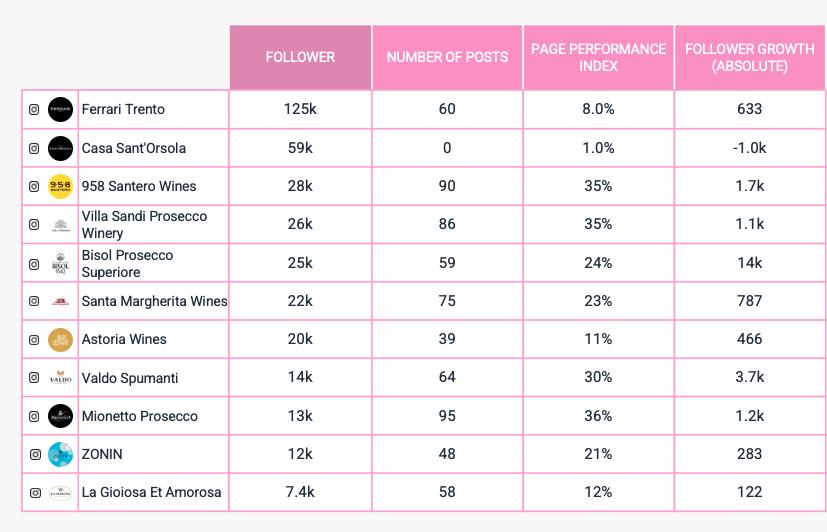 Medaglia d’oro per i più seguiti su Instagram va invece a Ferrari Trento con 125k follower, affiancato da Casa Sant’Orsola con 59k e da 958 Santero Wines con 28k. Il quadro cambia parlando di performance della pagina: al primo posto Carpenè-Malvolti (59%), Val d’Oca (49%) e Ruggeri Prosecco Valdobbiadene (48%).
