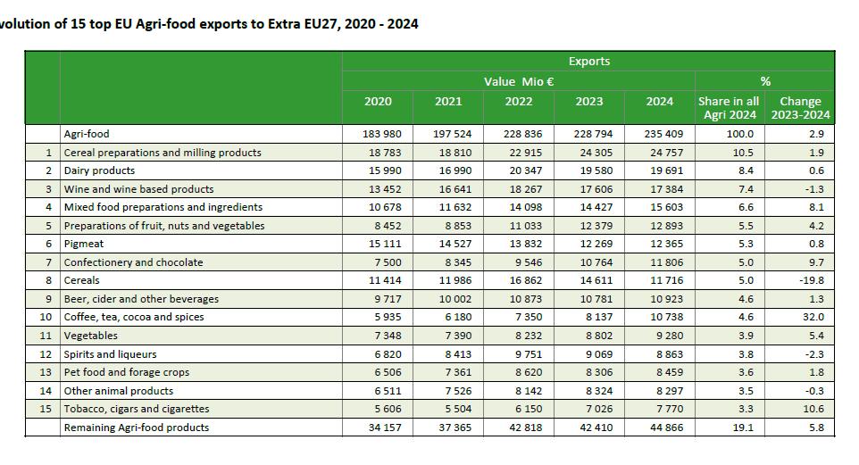 Among the main products sold, wine totalled at € 17.4 billion (about 7% of EU exports), while in the animal protein class, dairy stood at € 19.7 billion, accounting for 8.4% of the total. Cereal preparations and milling products led the trend for plant-based commodities with € 24.8 billion (10.5%).