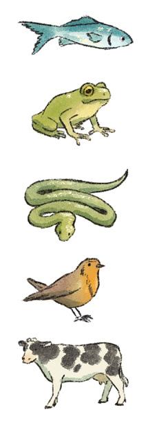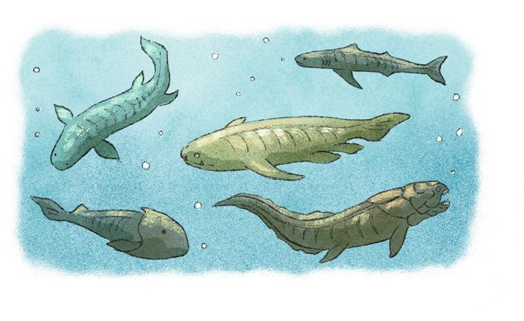 Comparvero poi i pesci preistorici , i primi animali ad avere uno scheletro fatto da una colonna vertebrale, composta di piccoli ossi, che va dalla testa alla coda. Anche l’uomo ha queste ossa nella schiena e per questo appartiene ai vertebrati .