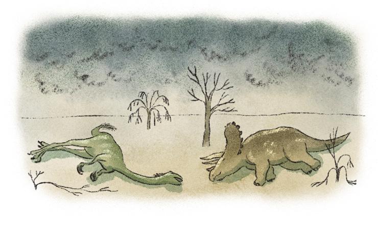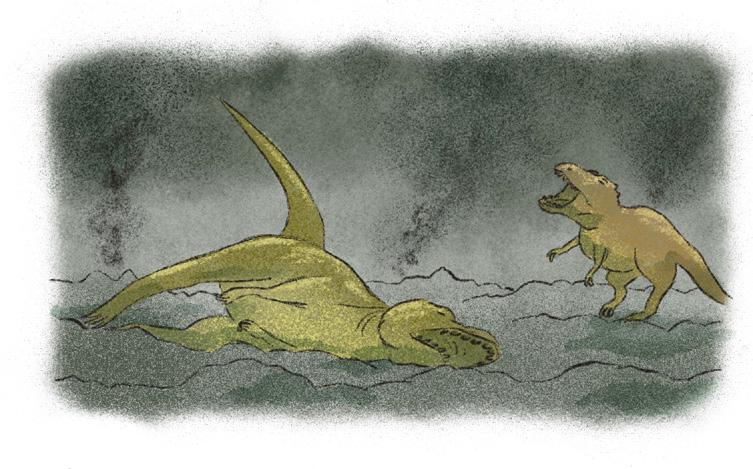 Per colpa di questo buio, molte piante morirono e di conseguenza i dinosauri erbivori non trovarono più cibo e si estinsero . Poi scomparvero i dinosauri carnivori che non trovavano più prede da cacciare e da mangiare.