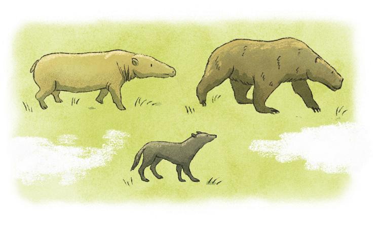 Poi comparvero mammiferi sempre più grandi. Con il tempo fecero la loro apparizione specie mai viste fino ad allora. C’erano gli antenati dei cani , degli orsi e degli ippopotami .