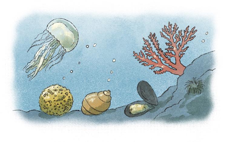 Poi, nell’acqua si formarono esseri sempre più grandi composti da molte cellule: gli organismi pluricellulari , come coralli, spugne, meduse e molluschi. All’interno non avevano lo scheletro.