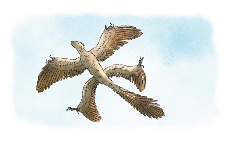 Microraptor erano piccoli dinosauri che avevano delle lunghe penne sia sulle zampe davanti che su quelle dietro. Correvano velocissimi e probabilmente prendevano il volo come un aereo, aprendo le loro quattro ali e planando!