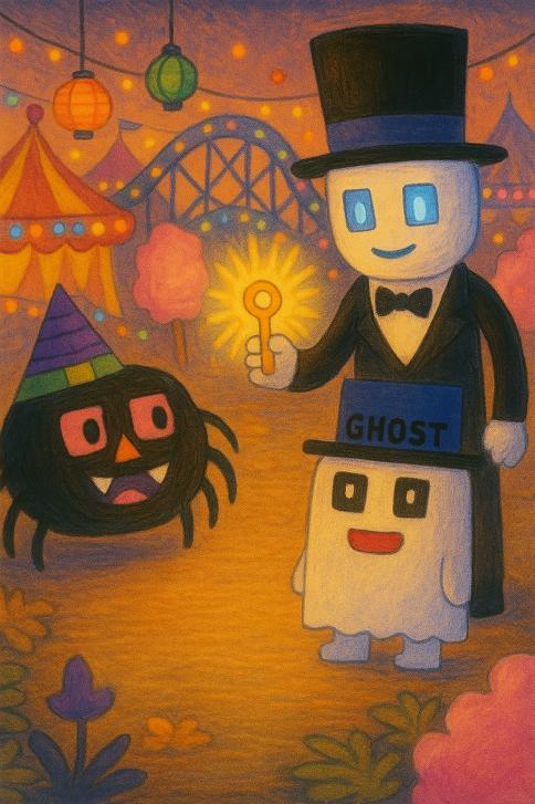 E da quella note, ogni Halloween, il luna park stregato si illumina di nuovo. Le giostre girano, le luci danzano… E se guardi bene, tra la nebbia e le stelle, puoi ancora vedere Tessy e Boo che salutano i bambini con un piccolo “Boo!” e un filo di ragnatela luccicante.