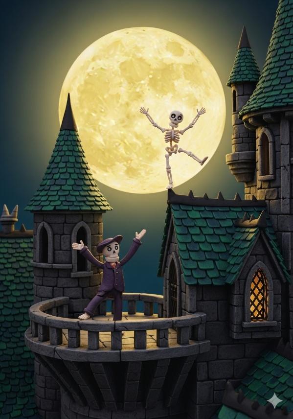 Le case erano piene di zucche luminose, le finestre decorate e i bambini mascherati correvano ridendo. Nessuno però sapeva che tra loro c’erano anche un vero scheletro e un ragno magico, che di tanto in tanto scomparivano nell’ombra per spaventare i più coraggiosi.