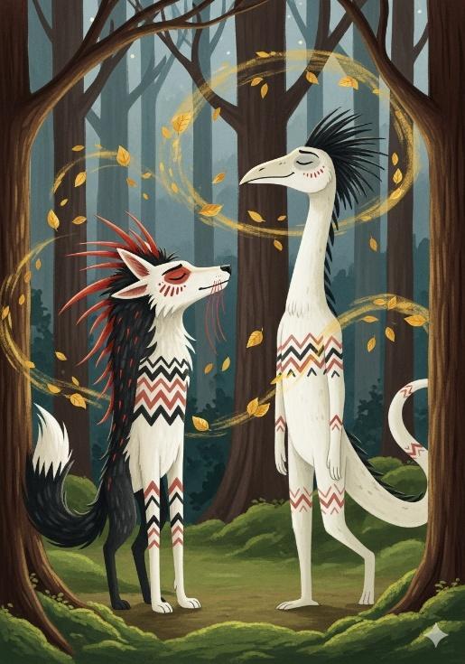 Poi, piano piano, si accorsero che le loro foglie dorate brillavano ancora, una luce sottile e tiepida che li aiutò a ritrovarsi. Quando si videro di nuovo, si abbracciarono senza dire niente. La paura non era sparita, ma era diventata più leggera. Quando la luce tornò, anche il bosco si risvegliò Dalle tane e dai tronchi scesero altri mostri. Lucsi, Fantasmadrago e Liemost si guardarono e risero. Avevano ancora il batticuore, ma ora era un batticuore felice.