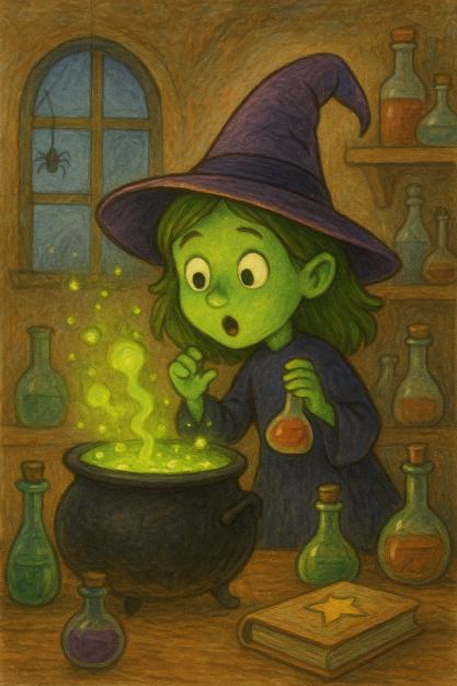 «Preparatevi al mio incantesimoooo!» gridò la strega con voce profonda. Poi agitò la bacchetta, ma… PFFF! Invece di un fulmine, uscì una nuvola di coriandoli colorati e un suono di… trombetta da festa!