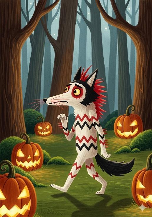 Nel bosco di notte tutto sembrava vivo. Le zucche si accendevano e si spegnevano come occhi curiosi, il vento sussurrava tra i rami, e da qualche parte si udiva un rumore misterioso. Lucsi avanzava piano, le orecchie tese. Aveva paura ma anche un po ’di curiosità.