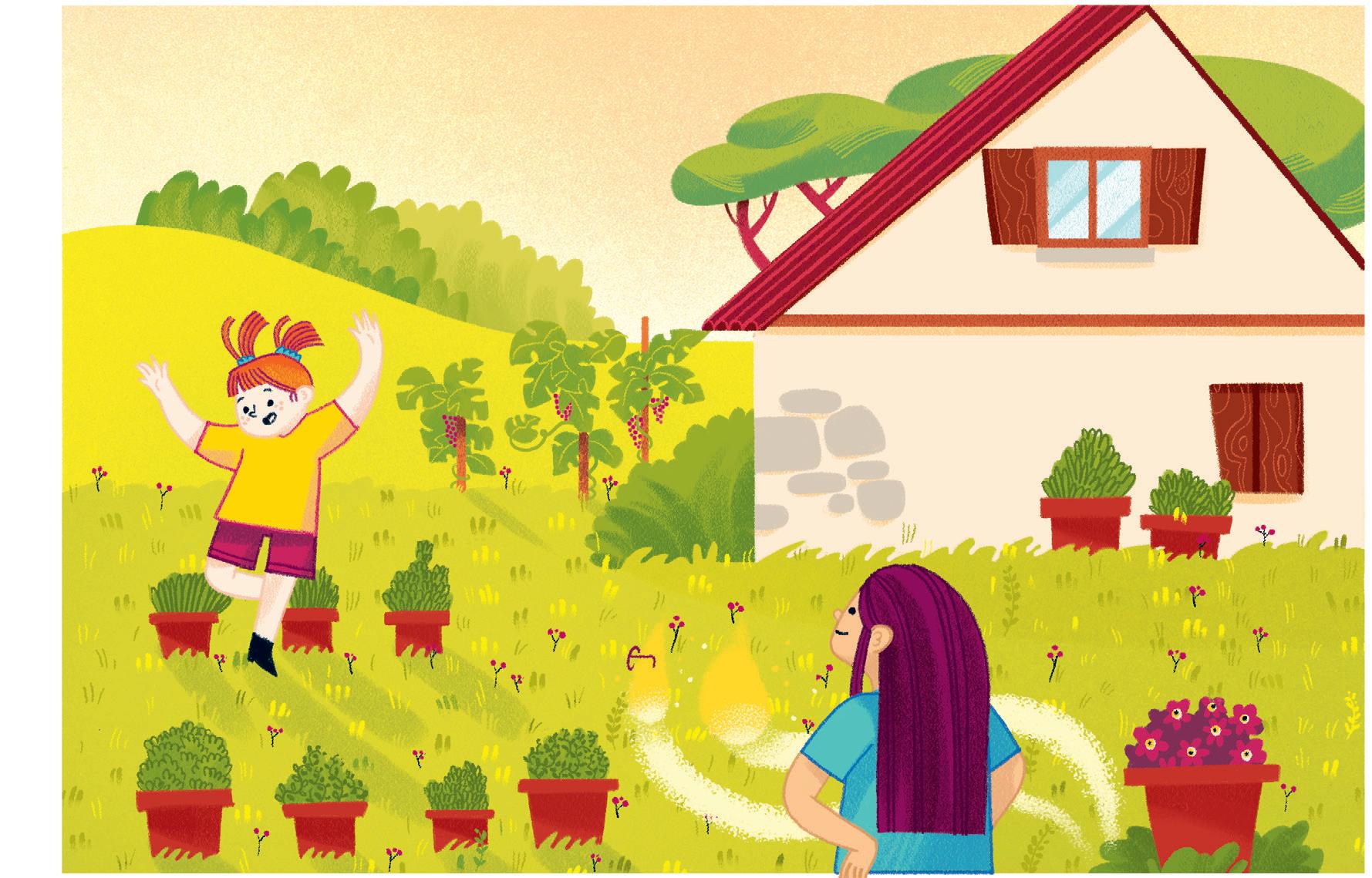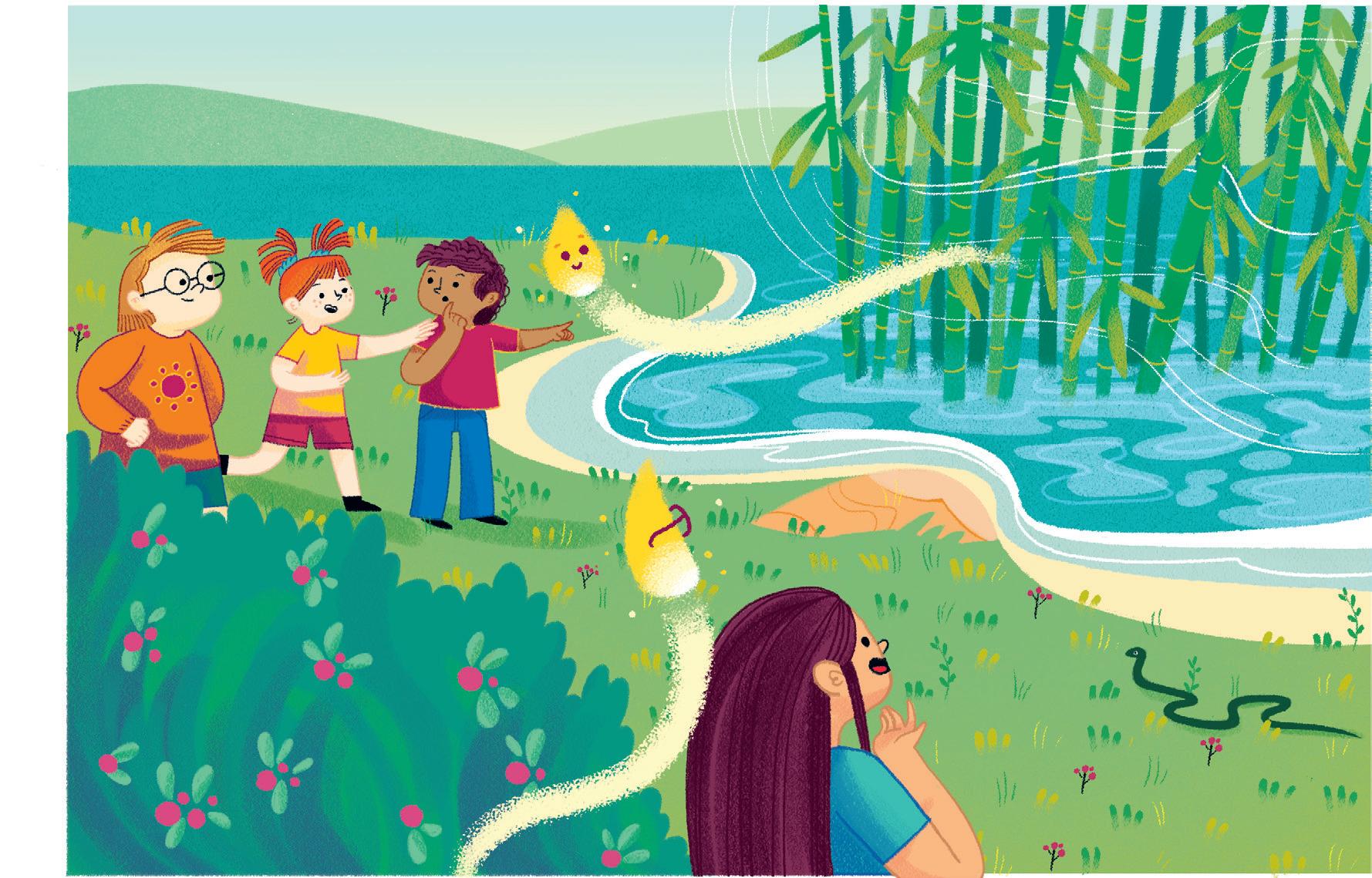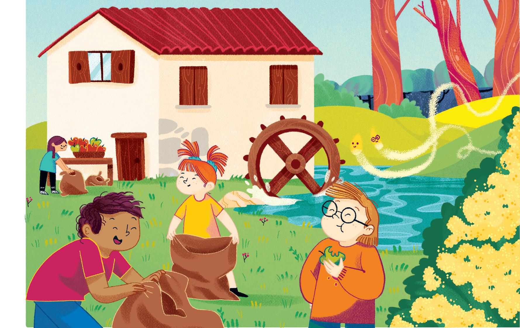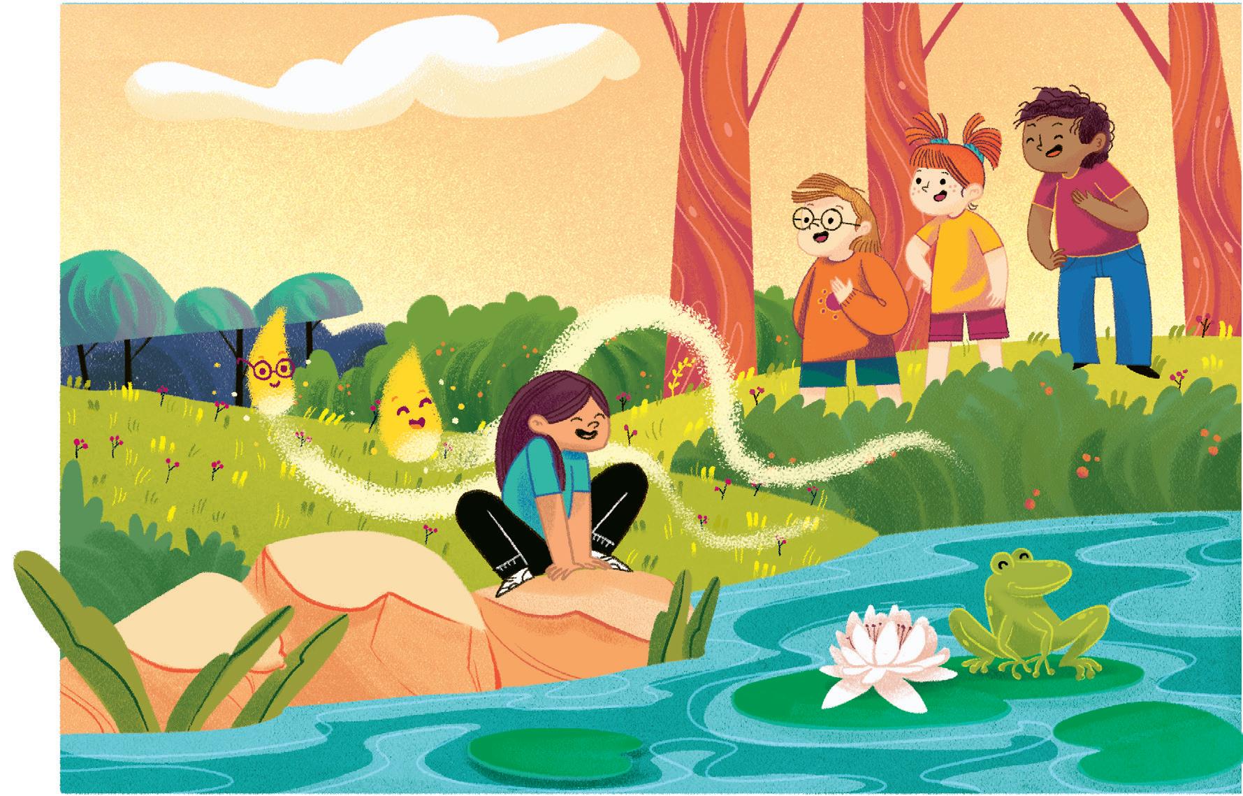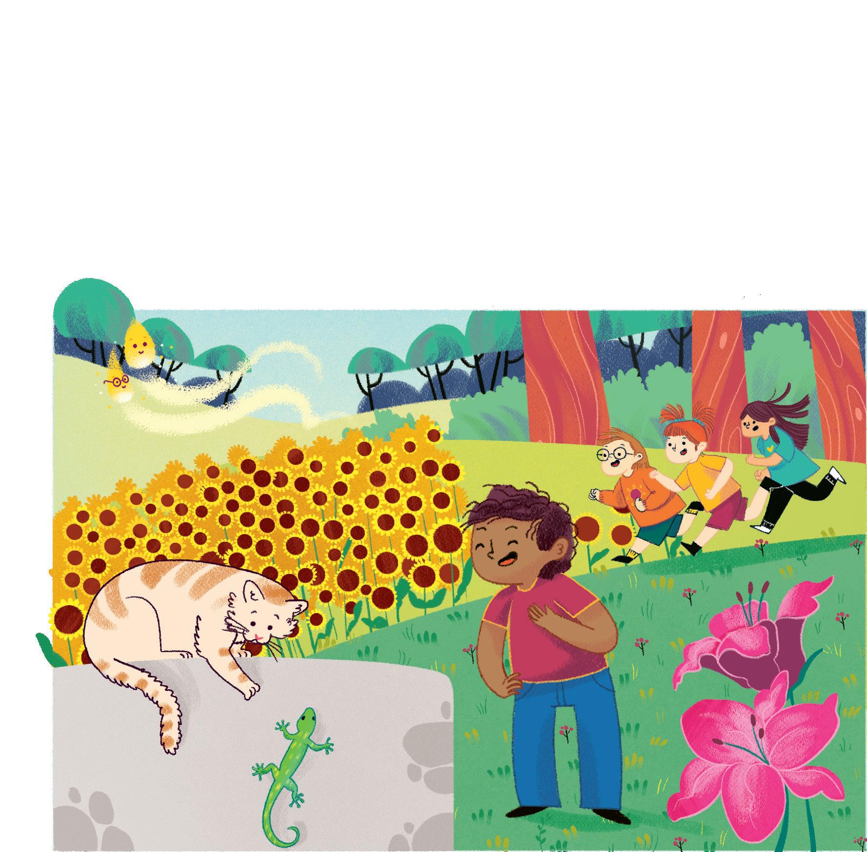 Pensa agli amici e all’amica che sta per incontrare vicino al fiumiciattolo. Mangia in fretta ed esce di casa: ecco Ines che sta facendo una corsetta. Ci sono anche Karim e Ale che, seduti sull’erba, si stiracchiano.