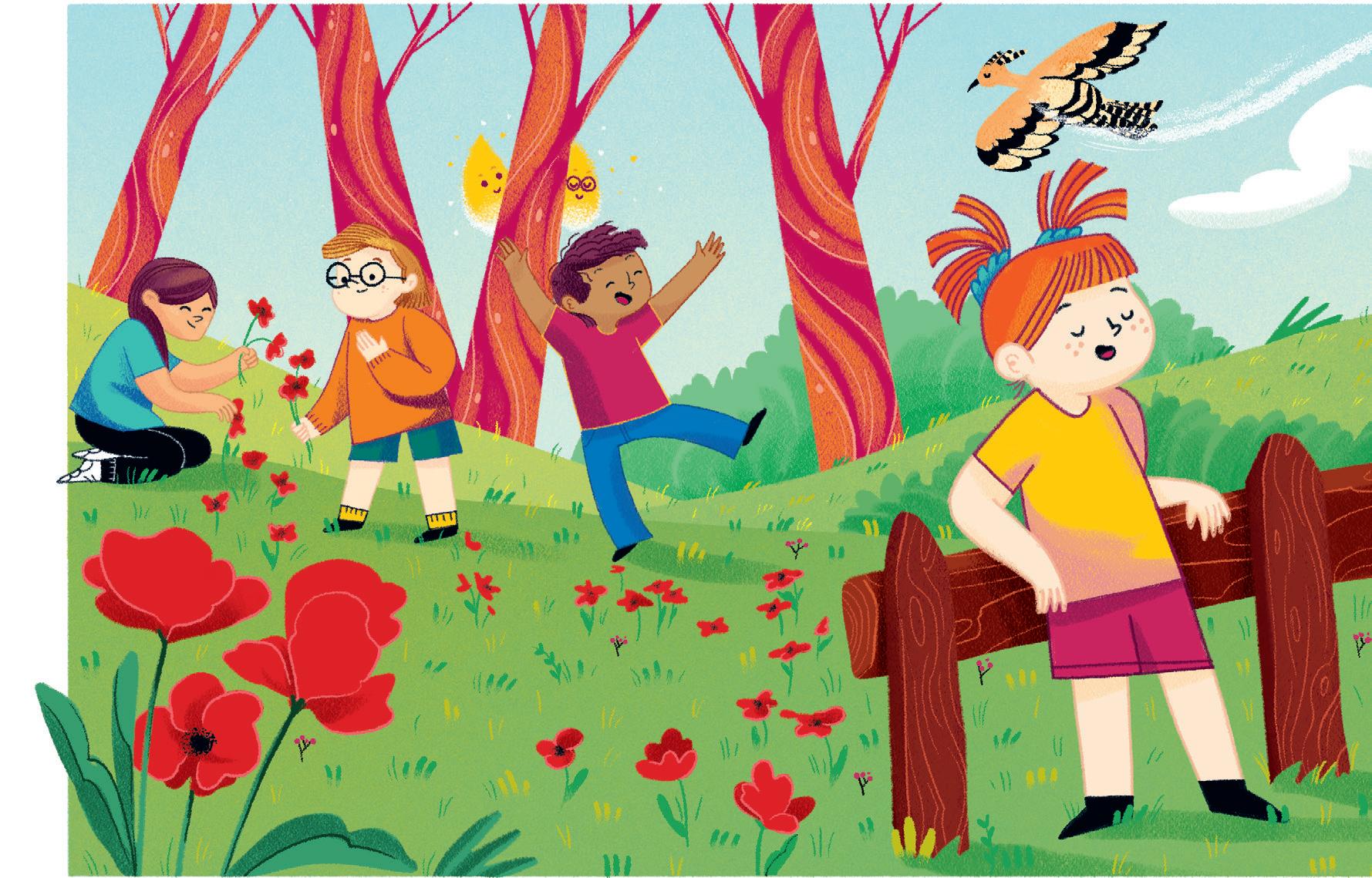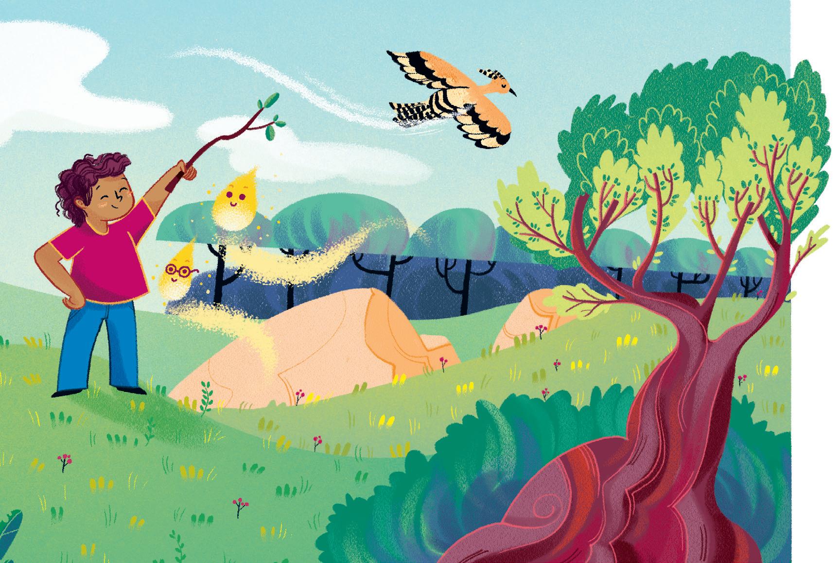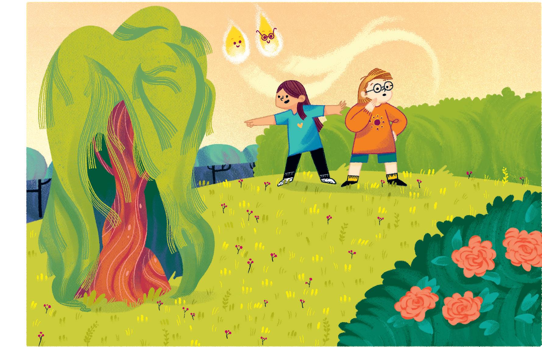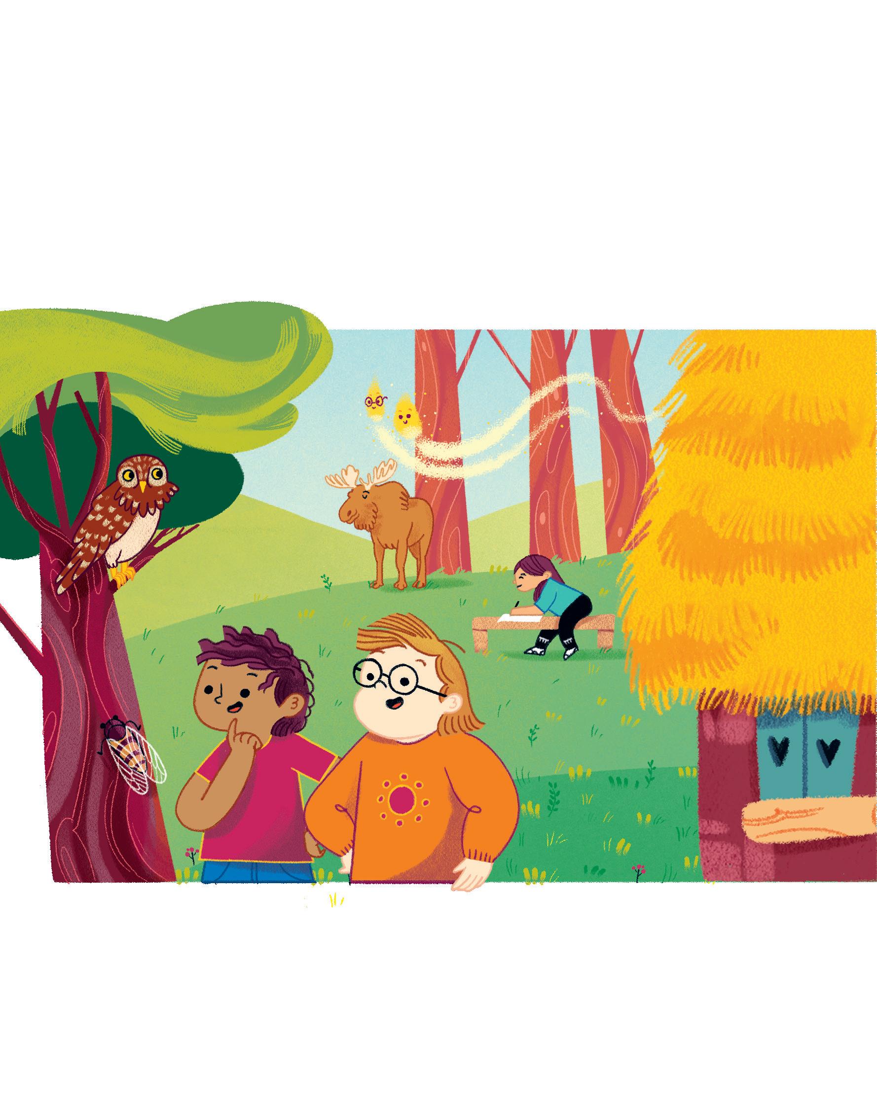 «Ale mi ha aiutato a colorare il cielo che è sempre la parte più difficile» prosegue Karim, contento che il suo amico e le sue amiche siano sempre pronti a dargli una mano. Il cielo sopra Boscoluce è pieno di cose da immaginare. Ale guarda in alto e fa l’occhiolino a Ines. Anche Emma alza gli occhi oltre le cime dei grandi alberi. Tra i rami del salice intravede uno scoiattolo.