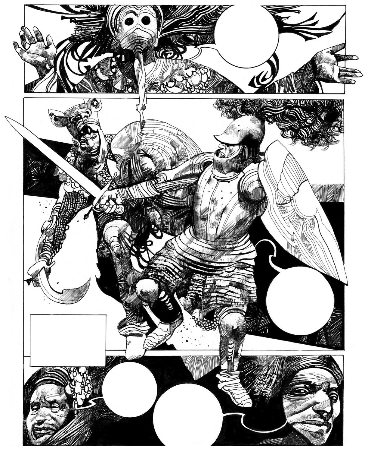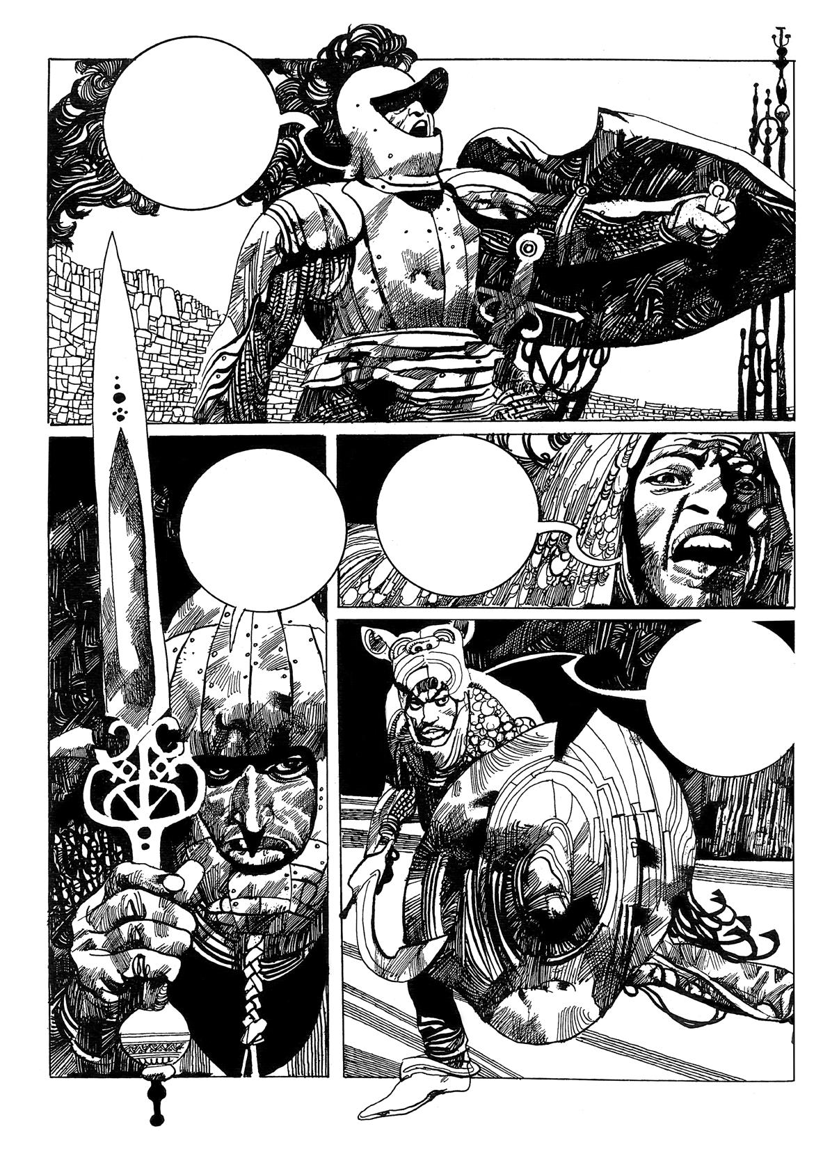 Il risultato è un’immersione in tavole se si vuole più fumettistiche rispetto alla precedente, che mantengono intatto il fascino non soltanto dei personaggi e delle atmosfere del Ciclo Carolingio, ma anche quello del tratto potente dell’autore milanese; pure quando è venato di sagace ironia. Uno dei tanti aspetti dell’uomo Sergio Toppi e della sua intera opera, come sottolinea lo scrittore Italo Alighiero Chiusano nel catalogo della personale Penne e inchiostri, tenutasi a Milano nel 1994: