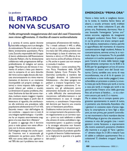 a carenza di sonno, specie durante l’età dello sviluppo, non è un dettaglio da sottovalutare. Ma non è solo un problema strettamente quantitativo. Maria Luisa Zuccolo, responsabile del Gruppo di lavoro adolescenza dell’Associazione Culturale Pediatri, che ha direttamente collaborato nella progettazione dell’approfondimento di indagine sul sonno, spiega: “Ritardare più del dovuto il momento di andare a letto può determinare la comparsa di un vero disturbo del ritmo sonno-veglia dovuto alla mancata sincronizzazione tra ritmo interno (tentativo di dormire in un momento incompatibile col proprio orologio interno) e ritmo imposto dalle esigenze sociali (alzarsi per andare a scuola). Le dimensioni di questo problema, chiamato Sindrome da fase del sonno ritardata, risultano essere maggiori rispetto alle conoscenze legate ai pochi dati di letteratura al riguardo, che attribuiscono alla sindrome una prevalenza nella popolazione adolescente tra il 7 e il 16%. Secondo invece i dati dell’indagine da noi condotta – seppure non si tratti di una indagine epidemiologica – il problema ha un impatto enormemente maggiore e la cosa deve farci riflettere”. A questo si aggiunge che il dormire poco e male spesso non viene affrontato con la dovuta attenzione. Dall’indagine emerge che anche quando l’insonnia non è occasionale gli adolescenti ne parlano poco. Oltre il 40% non avvisa della cosa i genitori e nel 78% dei casi il problema non viene