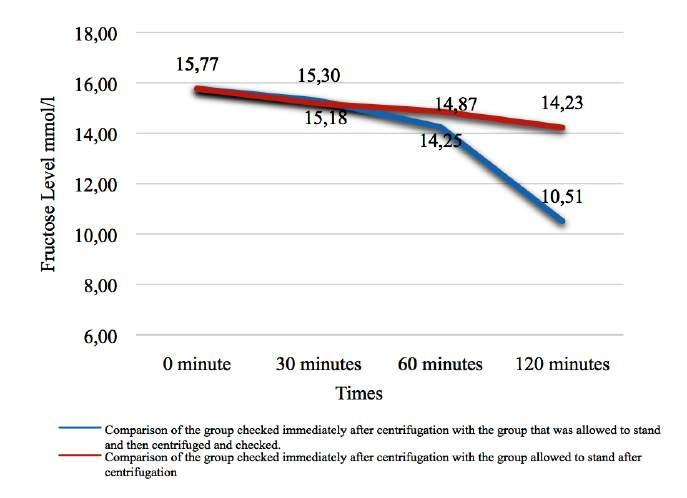 12186 Examination of ejaculate fr uctose levels on male infer tility patients at various times and centrifugation using semiautomatic method