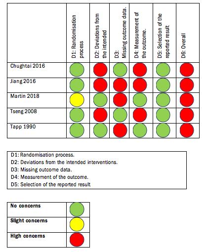 D2: in most studies patients, carers and people delivering the interventions were aware of the group assignment, but the study of Lin et al which submitted controls to sham treatment In some studies assessors were blinded to treatment (Alves et al, Sran et al ) (scored as “ some concerns”)