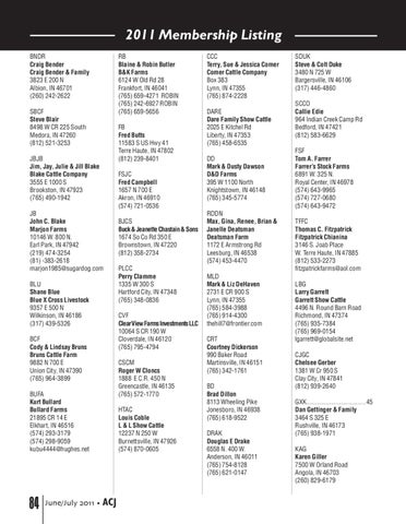 RB Blaine & Robin Butler B&K Farms 6124 W Old Rd 28 Frankfort, IN 46041 (765) 659-4271 ROBIN (765) 242-6927 ROBIN (765) 659-5656 FB Fred Butts 11583 S US Hwy 41 Terre Haute, IN 47802 (812) 239-8401 FSJC Fred Campbell 1657 N 700 E Akron, IN 46910 (574) 721-0536 BJCS Buck & Jeanette Chastain & Sons 1674 So Co Rd 350 E Brownstown, IN 47220 (812) 358-2734 PLCC Perry Clamme 1335 W 300 S Hartford City, IN 47348 (765) 348-0836 CVF Clear View Farms Investments LLC 10064 S CR 190 W Cloverdale, IN 46120 (765) 795-4794 CSCM Roger W Cloncs 1888 E C.R. 450 N Greencastle, IN 46135 (765) 572-1770 HTAC Louis Coble L & L Show Cattle 12237 N 250 W Burnettsville, IN 47926 (574) 870-0605