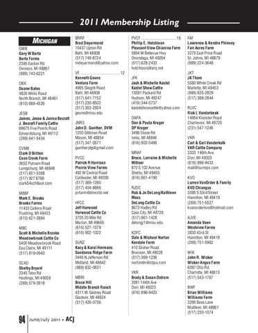 2011 Membership Listing Michigan GWB Gary W Barta Barta Farms 2385 Easton Rd Owosso, MI 48867 (989) 743-6221 DBX Duane Bates 4826 Willis Road North Branch, MI 48461 (810) 688-4526 JESB James, Jesse & Janice Becraft J. Becraft Family Cattle 69675 Five Points Road Edwardsburg, MI 49112 (269) 641-5434 CVMB Clark D Britten Coon Creek Farm 3652 Putnam Road Laingsburg, MI 48848 (517) 651-5368 (517) 927 8768 clark54ccf@aol.com MBBF Mark E. Brooks Brooks Farms 11433 Calkins Road Flushing, MI 48433 (810) 621-3884 MBC Scott & Michelle Brunke Meadowbrook Cattle Co 5400 Meadowbrook Road Eau Claire, MI 49111 (517) 819-0940 SCAD Shelby Bryant 2345 Tebo Rd Hastings, MI 49058 (269) 579-3918
