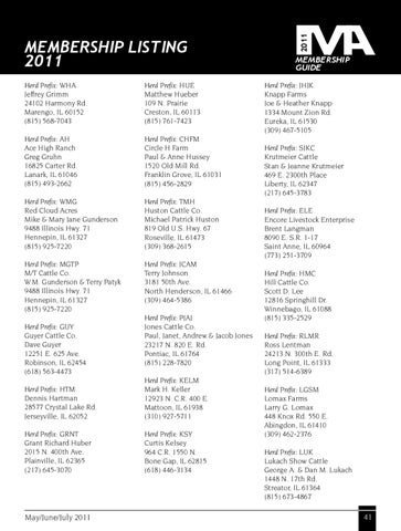membership guide Herd Prefix: JHJK Knapp Farms Joe & Heather Knapp 1334 Mount Zion Rd. Eureka, IL 61530 (309) 467-5105 Herd Prefix: SJKC Krutmeier Cattle Stan & Jeanne Krutmeier 469 E. 2300th Place Liberty, IL 62347 (217) 645-3783 Herd Prefix: ELE Encore Livestock Enterprise Brent Langman 8090 E. S.R. 1-17 Saint Anne, IL 60964 (773) 251-3709 Herd Prefix: HMC Hill Cattle Co. Scott D. Lee 12816 Springhill Dr. Winnebago, IL 61088 (815) 335-2529 Herd Prefix: RLMR Ross Lentman 24213 N. 300th E. Rd. Long Point, IL 61333 (317) 514-6389 Herd Prefix: LGSM Lomax Farms Larry G. Lomax 448 Knox Rd. 550 E. Abingdon, IL 61410 (309) 462-2376 Herd Prefix: LUK Lukach Show Cattle George A. & Dan M. Lukach 1448 N. 17th Rd. Streator, IL 61364 (815) 673-4867