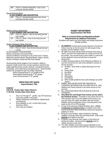 rd Any 4 y/o through 3 grader, (as of 9/1/previous year) may exhibit in this class. Health Certificates and Pollorum-Typhoid tests are Required. Entry deadline is July 1 at the Polk County Extension Office One entry per exhibitor.