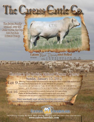 Charolais in the Rockies, National Western • Denver Sunday, January 15, 2012 • Offering ½ interest and full possession in the buyers choice of any fully owned Eaton Lot 9 Charolais bred proven herd sire, or any 2011 herd sire prospect. • Eaton herd sires are Trait Leaders for 7 traits - BW, WW, Milk, MCE, HCW, REA, MB - in the Fall 2011 Sire Summary. • In the fall evaluation, 18 of the top 50 sires for Marbling - 5 of the top 10 - are Eaton herd sires.