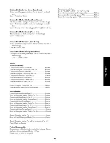 Awards Production Poultry Champion Production Pullet Pen ...................................Rosette Reserve Champion Production Pullet Pen ....................Rosette Champion Production Hen Pen .....................................Rosette Reserve Champion Production Hen Pen ......................Rosette Champion Production Duck-Pen (2) ..............................Rosette Reserve Production Duck-Pen (2) ..................................Rosette Champion Production Geese-Pen (2) ............................Rosette Reserve Production Geese-Pen (2) .................................Rosette Grand Champion Production Pen .................................Banner Reserve Grand Champion Production Pen ..................Banner Market Poultry Champion Market Broiler-Pen (3) ..................................Rosette Reserve Champion Market Broiler-Pen (3) ...................Rosette Champion Market Roaster-Pen (3) .................................Rosette Reserve Champion Market Roaster-Pen (3) ..................Rosette Champion Market Duck-Pen (2) .....................................Rosette Reserve Champion Market Duck-Pen (2) ......................Rosette Champion Market Geese-Pen (2) ....................................Rosette Reserve Champion Market Geese-Pen (2) .....................Rosette Champion Market Turkey-Pen (2) ....................................Rosette Reserve Champion Market Turkey-Pen (2) .....................Rosette Grand Champion Market Pen ..........................................Banner Reserve Grand Champion Market Pen ...........................Banner Grand Champion Market Pen will be auctioned off at 4-H Family Night on Sunday. Poultry Showmanship Showmanship will be held following the bird Judging. Classes for Junior, Intermediate, and Senior 4-H’ers. No pre-entry or entry fee required.