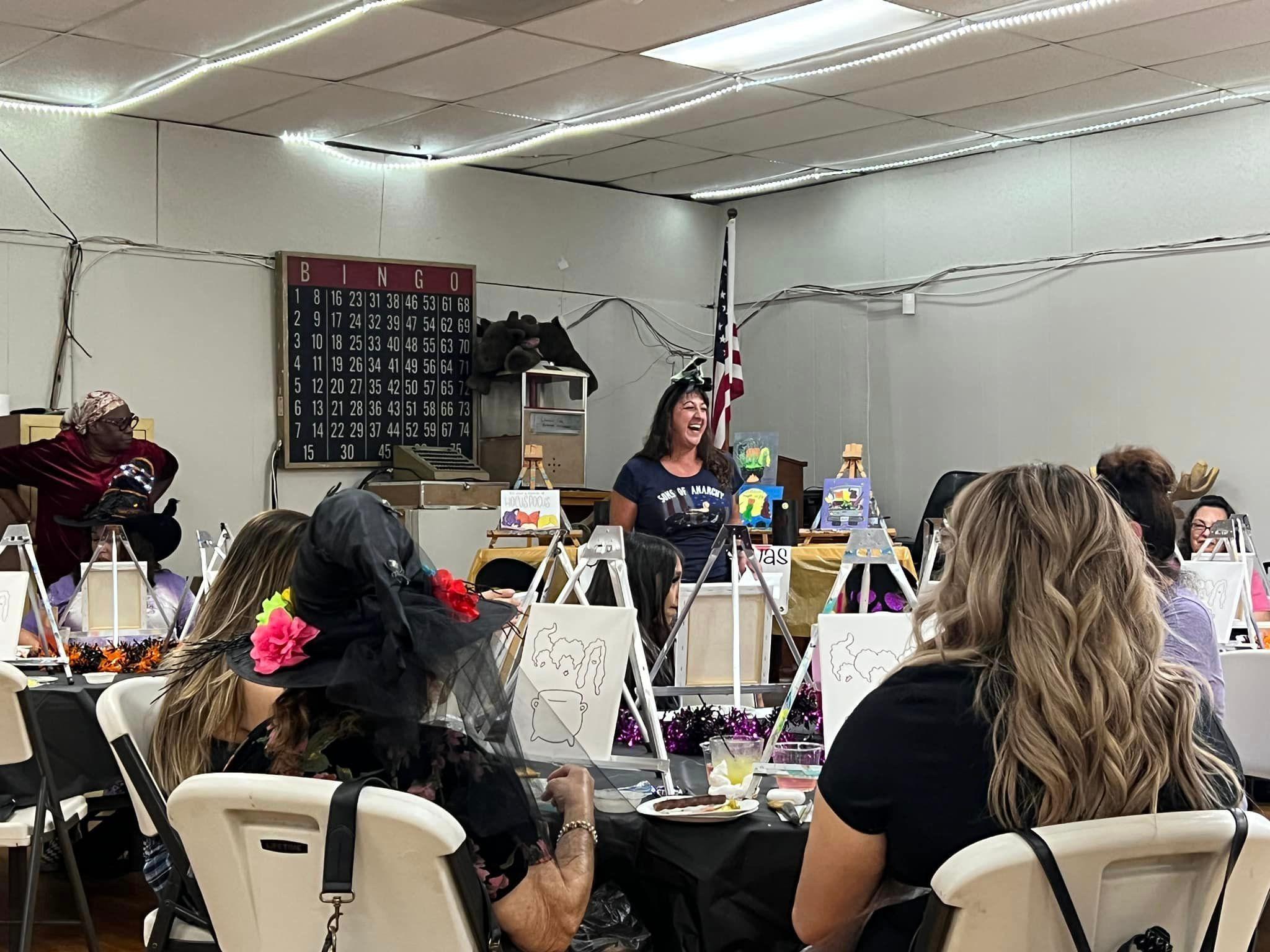 Board Chair, Dani Bettencourt, greets guests of the Hocus Pocus Paint Party held at Moose Lodge in Tracy, CA.