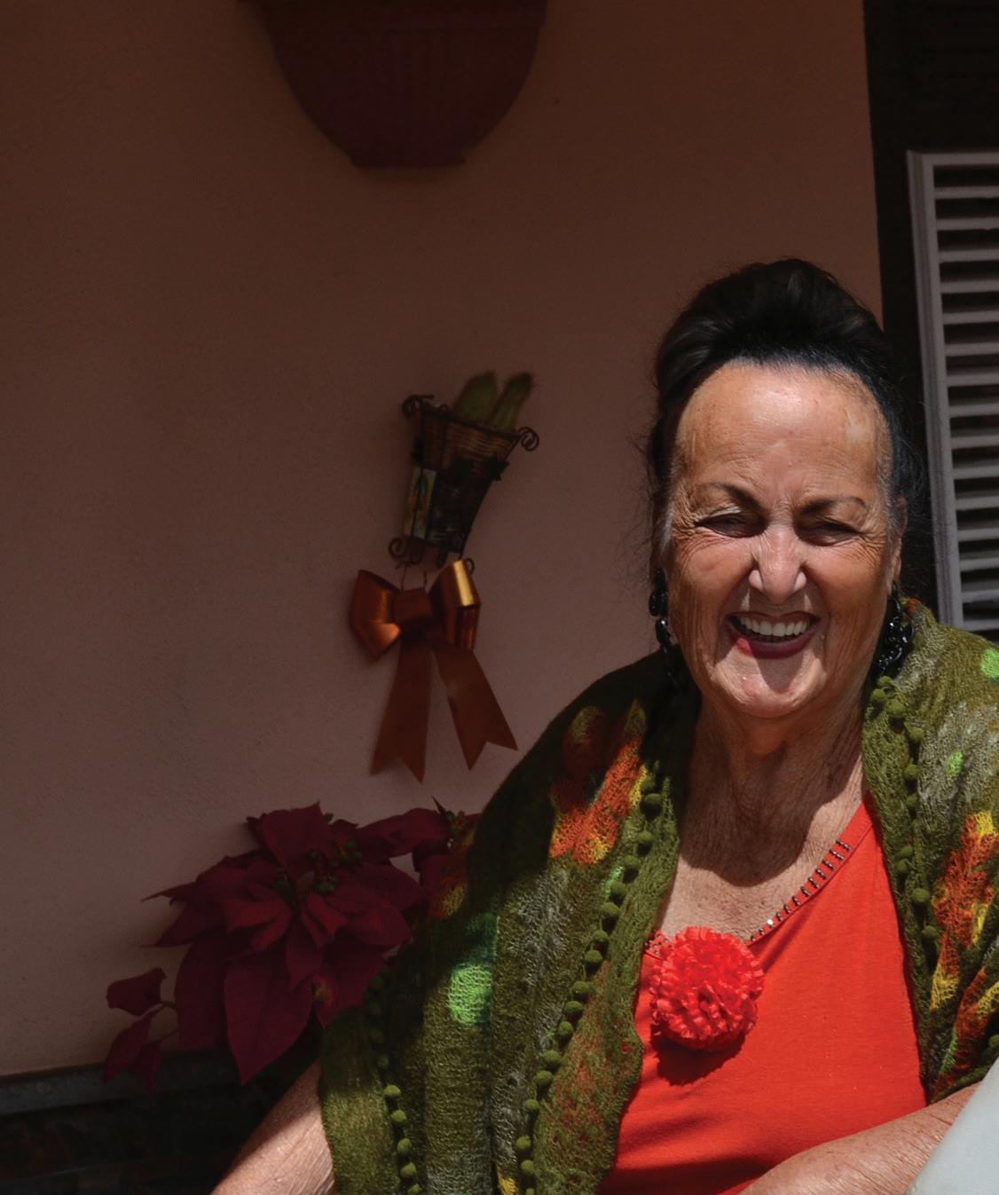 Cuando llegamos a su casa para esta entrevista, la encontramos “como para ir de fiesta”, como dice la canción. Pero su elegancia no se preparó para las fotos. Su elegancia es cotidiana. Día sí y el otro también. Toma su tiempo para maquillarse, hacerse el moño, escoger los zarcillos, el vestido, la manta o mantilla. “Que a los hombres lo que les gusta son los arreglos, ¿no?”, nos dice con un toque de coquetería. Nos enseñó cada pieza de la casa. Muchos cuadros, muchas flores, mucha decoración y mucho orden. Sin disimular el orgullo, también nos mostró su cuidada colección de zarcillos. Una de sus nietas suele recordarle: “Abuela, ríete, que cuando lo haces eres más guapa”. Y ella se ríe constantemente, a pesar de su queja: “No hay una persona que ha trabajado tanto, que ha sufrido tanto como yo. No lo hay. Mira que lo mío da para llenar una novela. Lo que yo he trabajado en esta vida, no aquí, sino en Venezuela”.