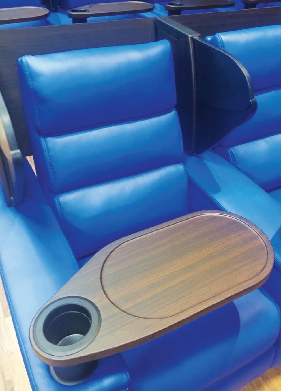 The seats are wide, cushioned and electrically adjustable including the head rest. There is a divider between seats that can be put in place. If you do not know the person you are sitting next to just drop it down and you have privacy. I call it a sneeze bar for the chair. Rows are wide with a lot fewer seats in each theater. Each seat has a tray table with a cup holder for